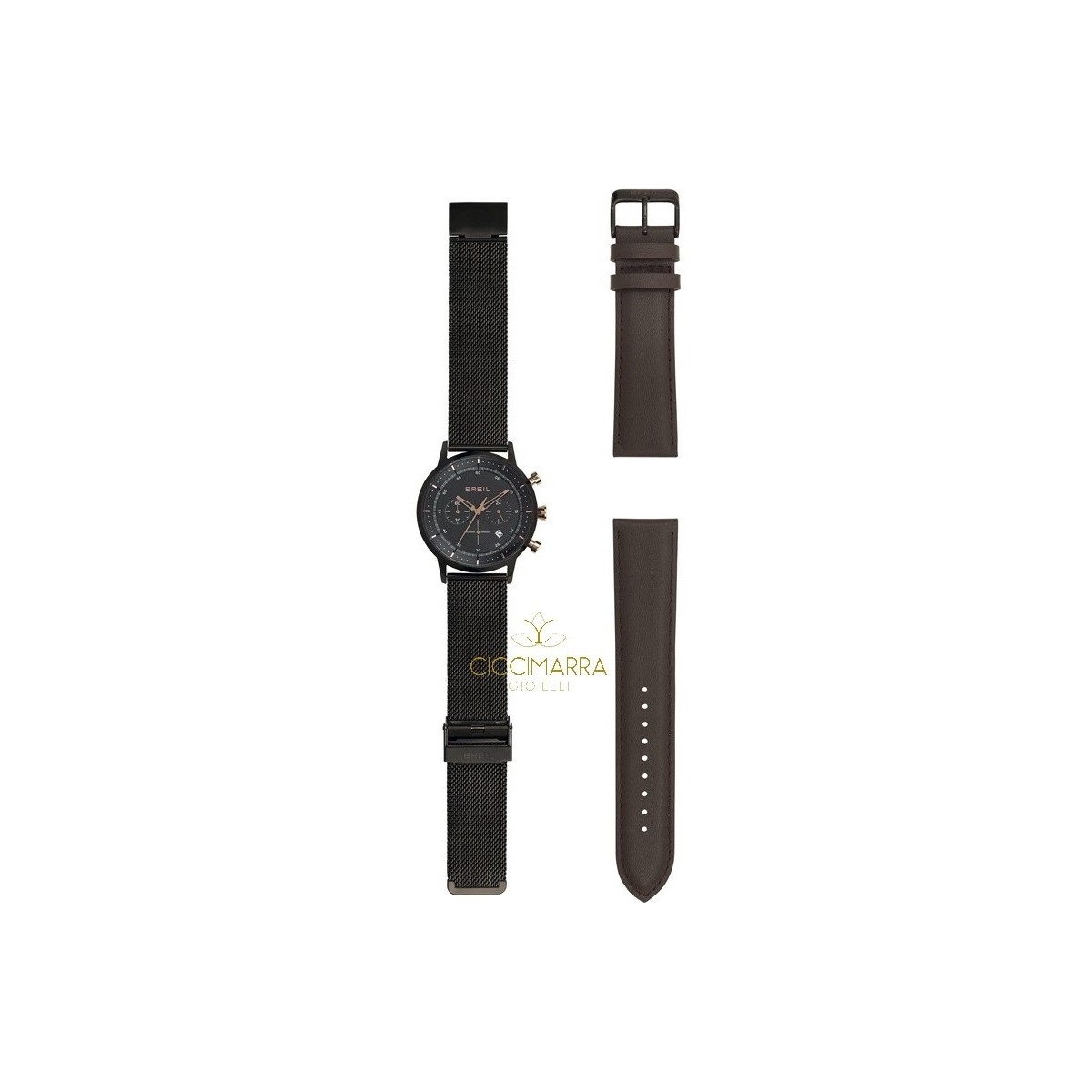 A male chronograph that owes its name to the care with which the counters have been studied at 3, 6 and 9 o'clock, each with a different layout from the other. The watch has a black IP steel case, like the dial, with pink gold IP spheres and buttons and a special mesh bracelet / strap. It is offered in a special pack containing a brown leather strap. Chronograph with TMI VD53 movement. 44mm steel case with black IP treatment. Pink gold crown and IP buttons. Black dial with satin finish. IP gun counters. IP black spheres. Mineral glass. Daters. W.R .: 5 atm. Black steel strap with IP black Milanese buckle closure. Additional brown leather strap with IP gun buckle closure.