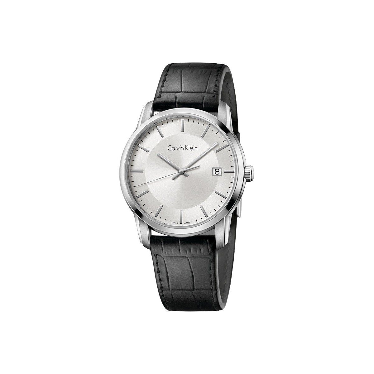 Infinite man watch with stainless steel case, silver dial, quartz movement and crocodile-embossed black leather strap #ckminute