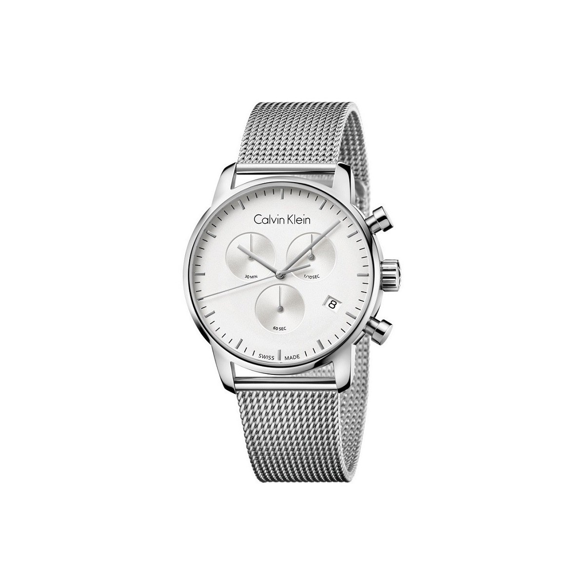 Watch CK City Watch man with silver dial, quartz chronograph movement and mesh steel bracelet.