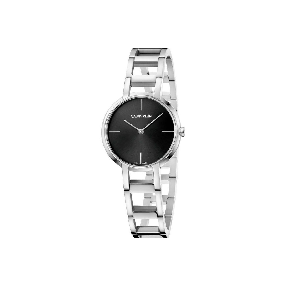 Calvin Klein Cheers Essential. Sophisticated. Calvin Klein cheers. This new model brings to mind the American origins of the brand thanks to its design inspired by the urban skyline. Geometric shapes in succession create a bracelet inspired by a jewel. Woman - FINISH Polished and brushed - CASE MATERIAL Steel 316L - DIAL COLOR Black - STRAP MATERIAL Steel 316L - STRAP COLOR Silver - - - MOVEMENT TYPE Quartz - MOVEMENT ETA 901.001 - HM FUNCTIONS - Swiss Made - WATERPROOF 3bar (30 m) - CASE DIAMETER 32.00 mm - GLASS Mineral - TYPE OF CLOSURE Jewel closure