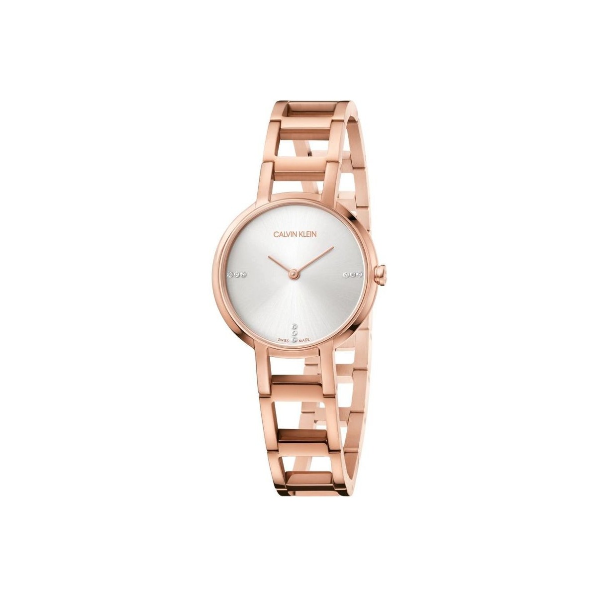 Calvin Klein Cheers - Essential PVD. Sophisticated. Calvin Klein cheers. This new model brings to mind the American origins of the brand thanks to its design inspired by the urban skyline. Geometric shapes in succession create a bracelet inspired by a jewel. Woman - FINISH Polished - CASE MATERIAL Rose gold PVD - DIAL COLOR Silver - with diamonds - STRAP MATERIAL 316L steel - STRAP COLOR Rose gold PVD - - - MOVEMENT TYPE Quartz - ETA 901.001 MOVEMENT - HM FUNCTIONS - Swiss Made - WATERPROOF 3bar ( 30 m) - CASE DIAMETER 32.00 mm - GLASS Mineral - TYPE OF CLOSURE Jewel closure