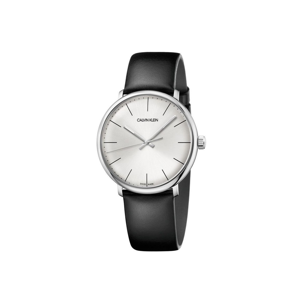 Mascolino leather strap. Retro-modern. Calvin Klein high noon. A fusion of radical modernity and timeless sophistication. This watch, which recalls vintage models, is recognizable thanks to its soft lines, a curved glass and a stone-shaped case. Man -