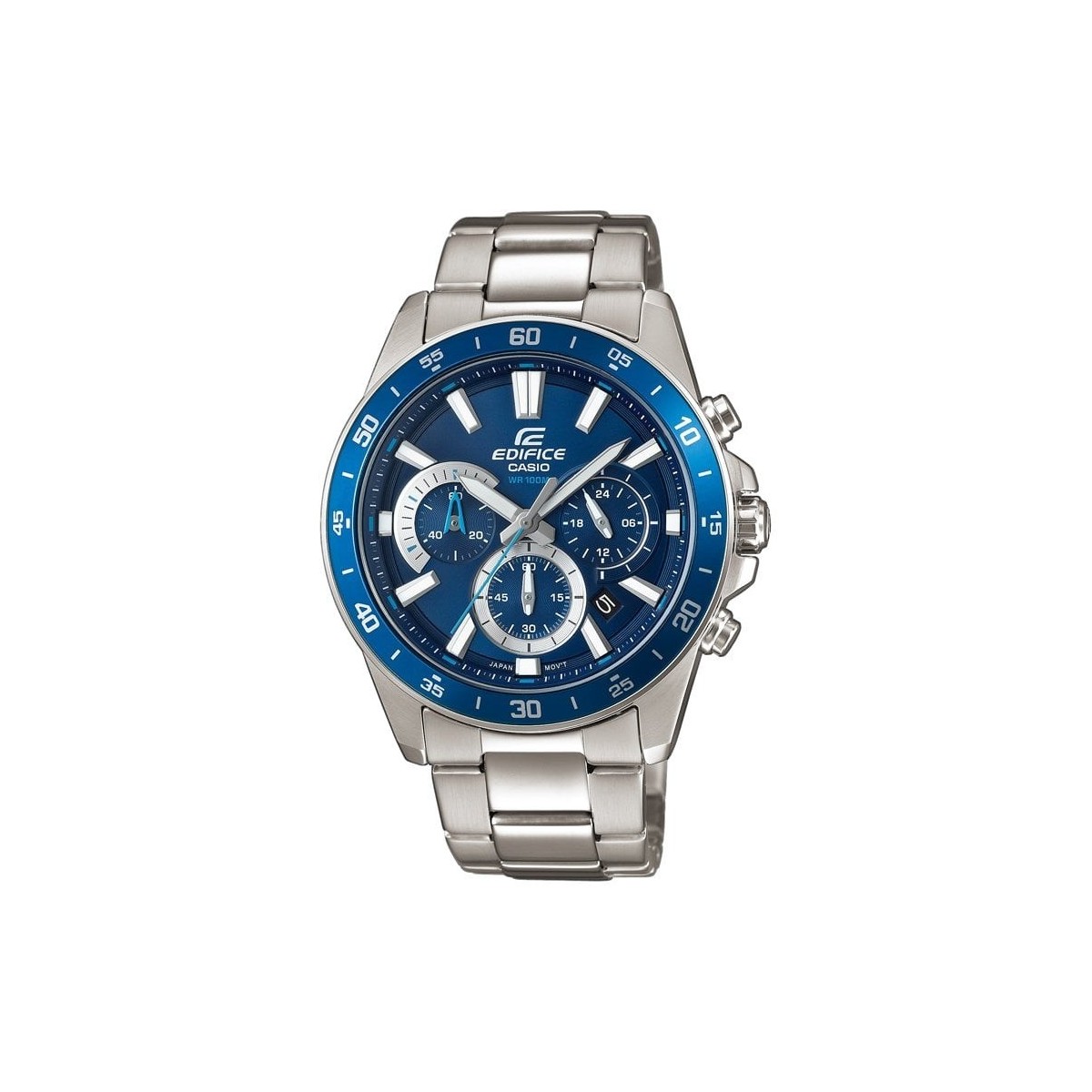 Quartz Man watch with chronograph and blue dial, steel case and bracelet, deployant clasp, date model Edifice
