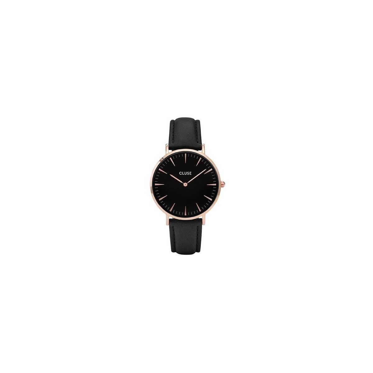 Watch CLUSE collection: La Boheme, the shape of the round black dial, black leather strap, quartz movement rose gold plated case, MVT. MIYOTA 2025 2/spheres unisex.