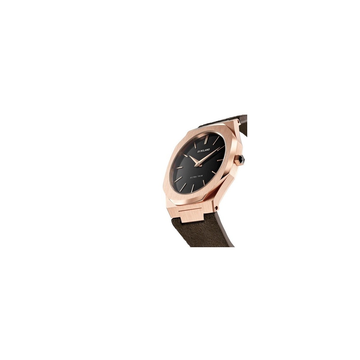 Quartz men's watch, Ultra Thin model in leather with brown suede belt, rosè pvd treatment case, black dial, rosé-plated hour markers, sapphire crystal and octagonal bezel type Audemars Piguet 40mm wide and 6mm narrow octagonal dial; New
