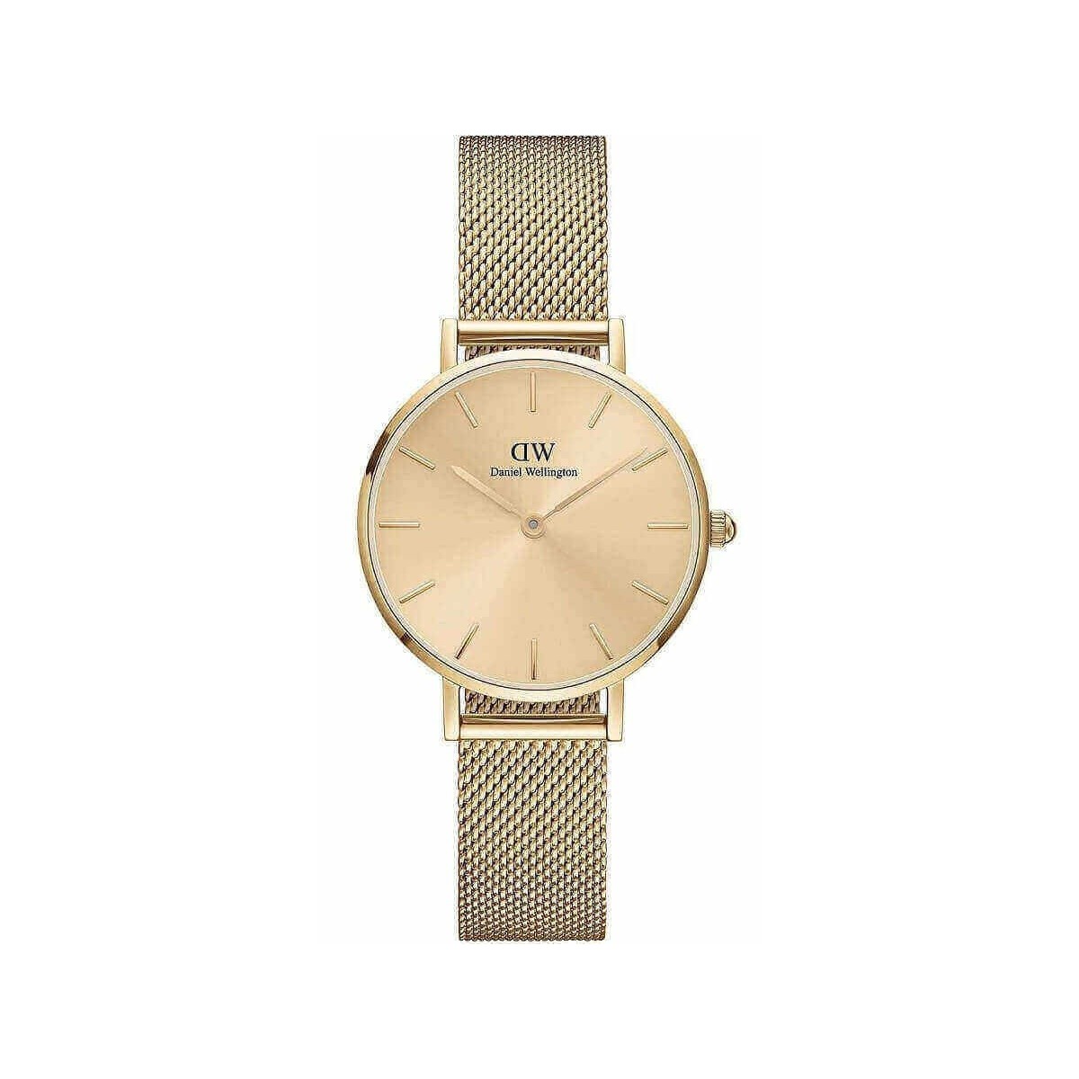 Daniel Wellington women's time only watch from the Petite Unitone collection with 28 mm polished stainless steel case, a delicate but noticeable presence. Milan mesh bracelet and gold colored dial