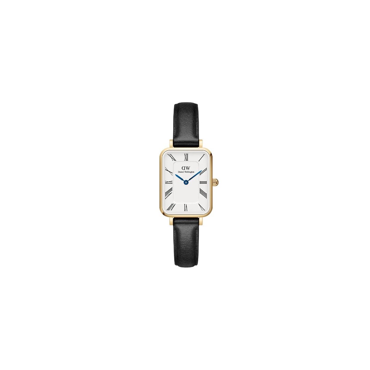 Daniel Wellington women's watch, from the Quadro Roman collection, with time-only function and quartz movement. The watch is made with an ultra-thin yellow gold-plated stainless steel case with a diameter of 20 mm x 26 mm and a thickness of 6 mm. White dial with Roman numerals and blue steel hands, black leather strap; buckle closure.