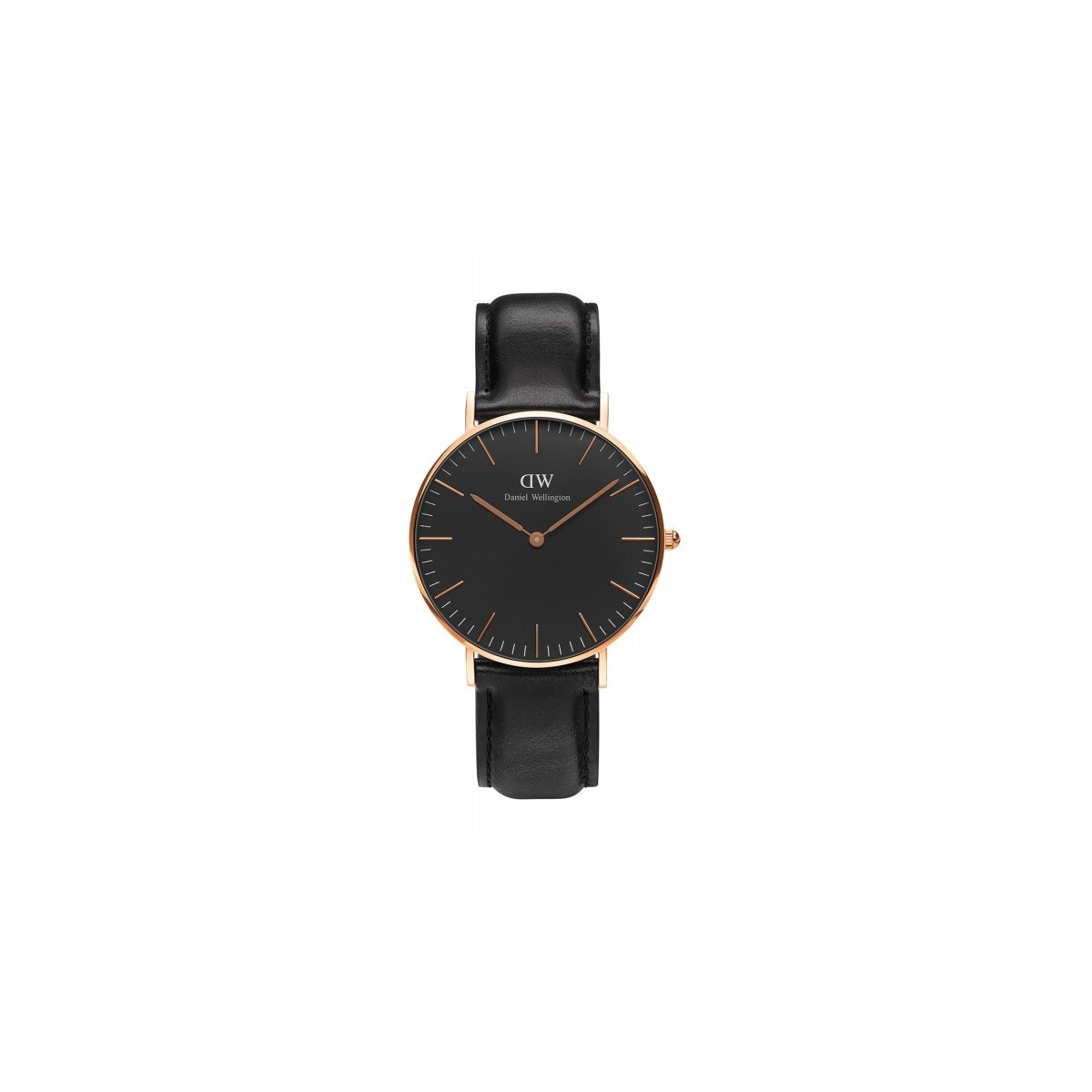 The Classic Watch Black PVD steel case with rose, little Sheffield with time only quartz movement, black dial and black smooth leather strap-DW00100139