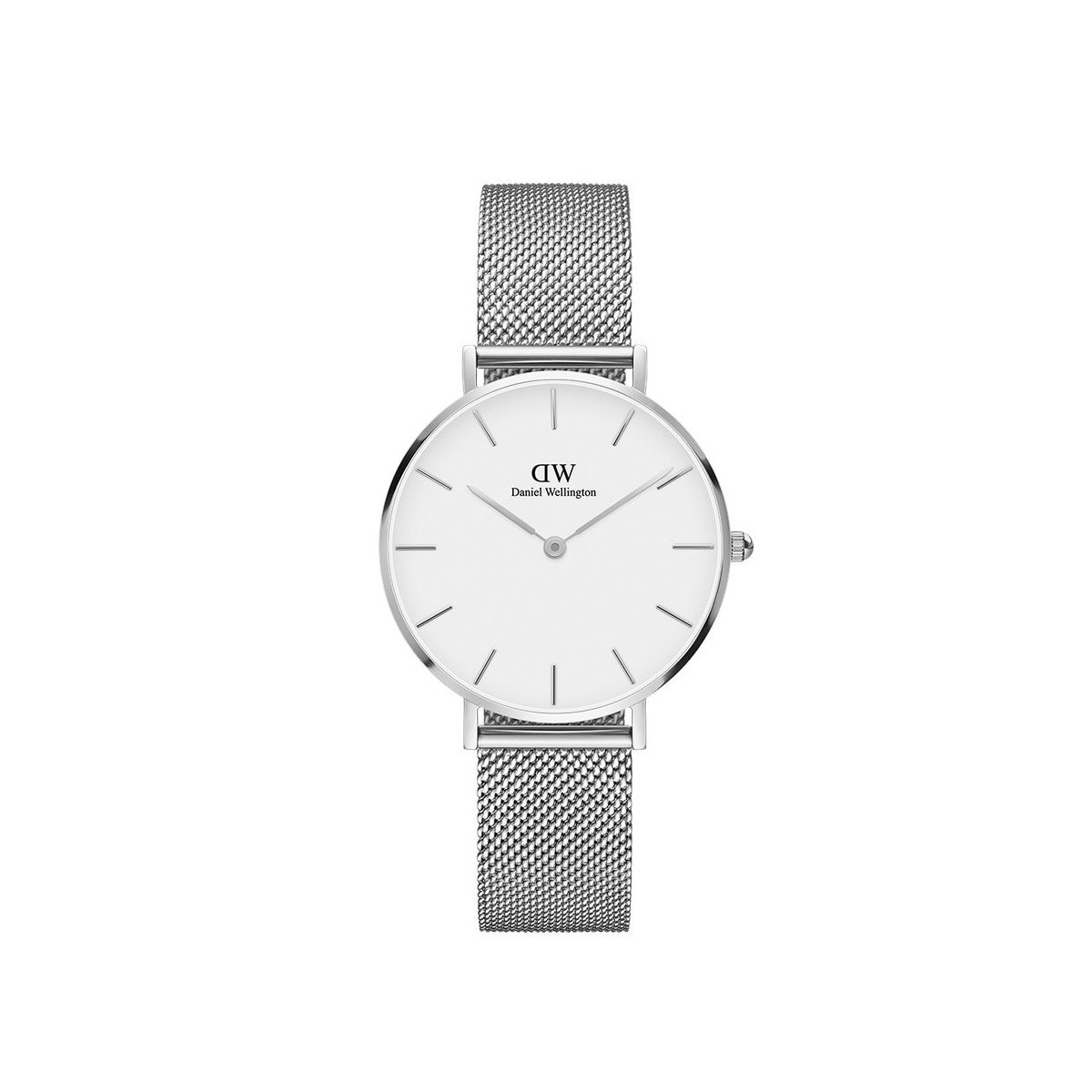 Classic Petite Sterling line watch, 32 mm with white dial and silver case. Milanese steel mesh strap, adjustable.