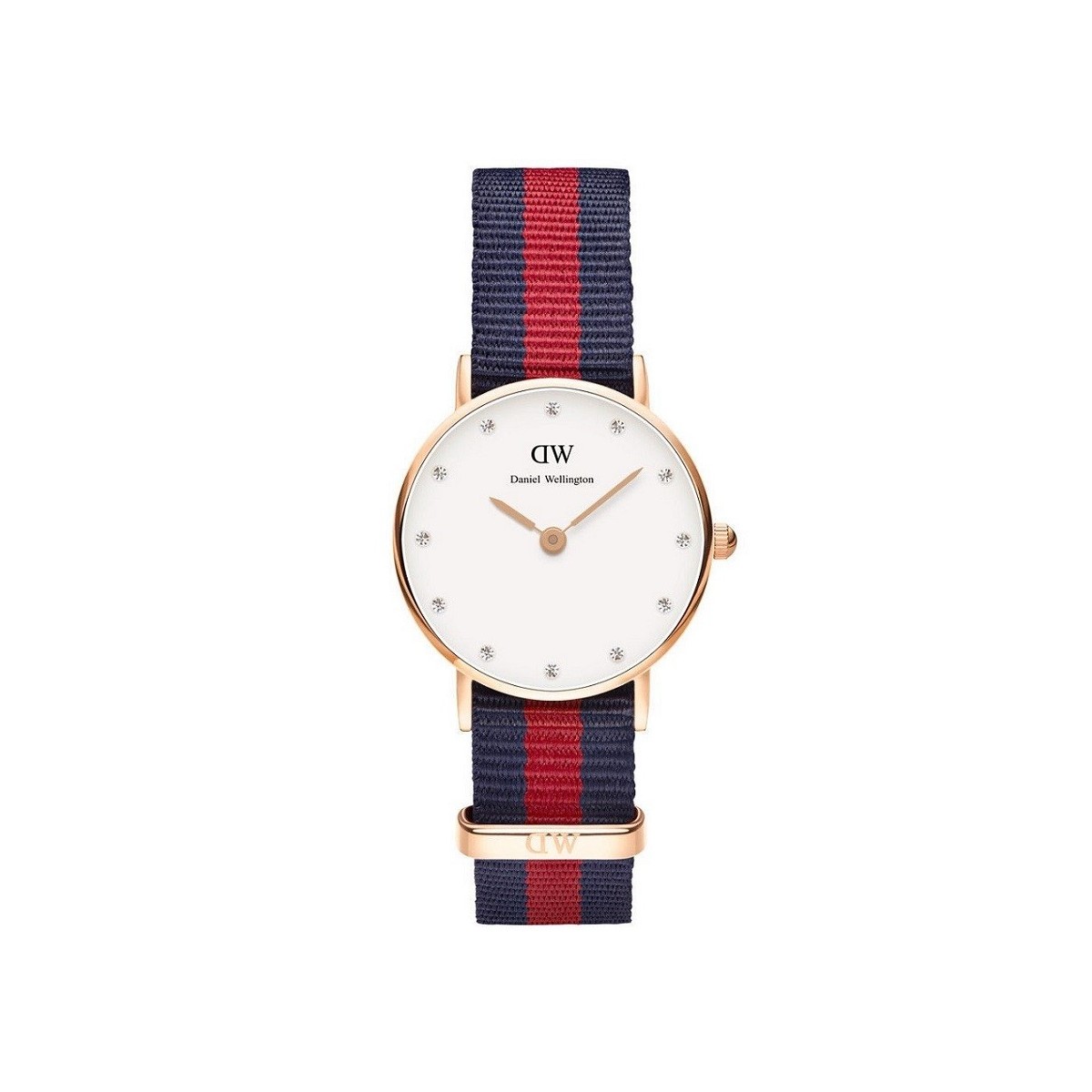Women's 26mm watch with quartz time only movement, white egg shell dial with Swarovski crystal hour markers and NATO blue and red fabric strap - 0905DV