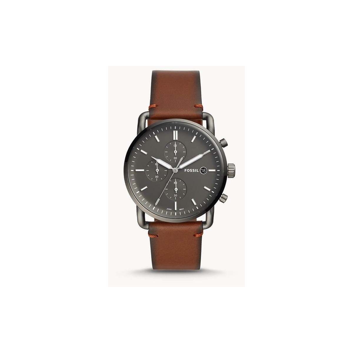 Chronograph men's watch with amber leather strap, smoke gray steel case and gray dial with white hour markers and hands, date display at 3 o'clock.