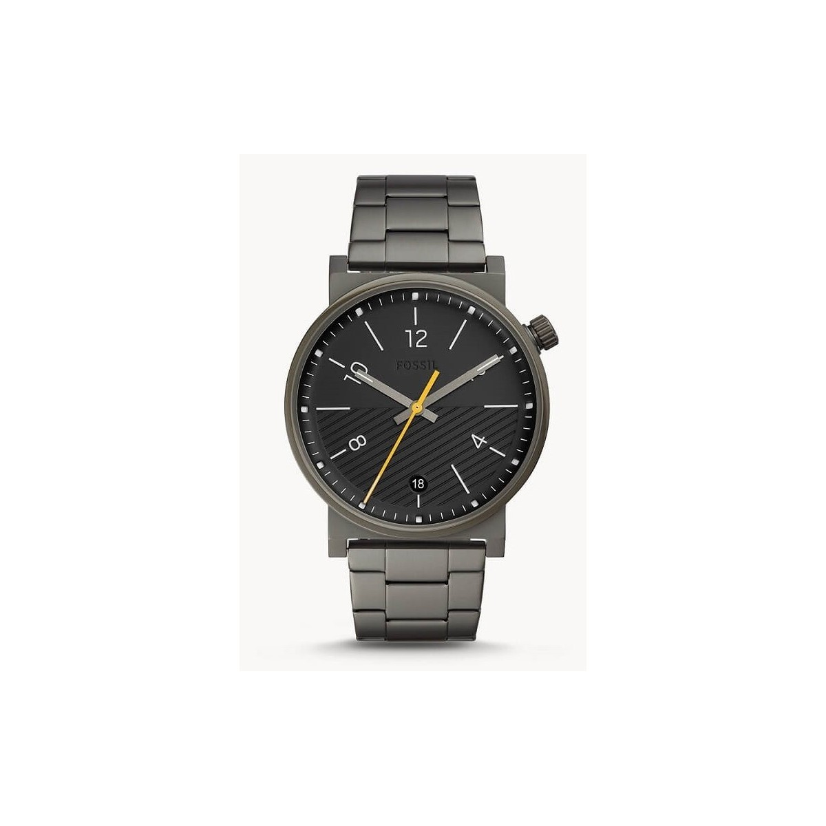 Men's watch with quartz movement, smoke gray steel strap and case, black dial with white indexes and numbers, silver and yellow hands, date display at 6 o'clock.