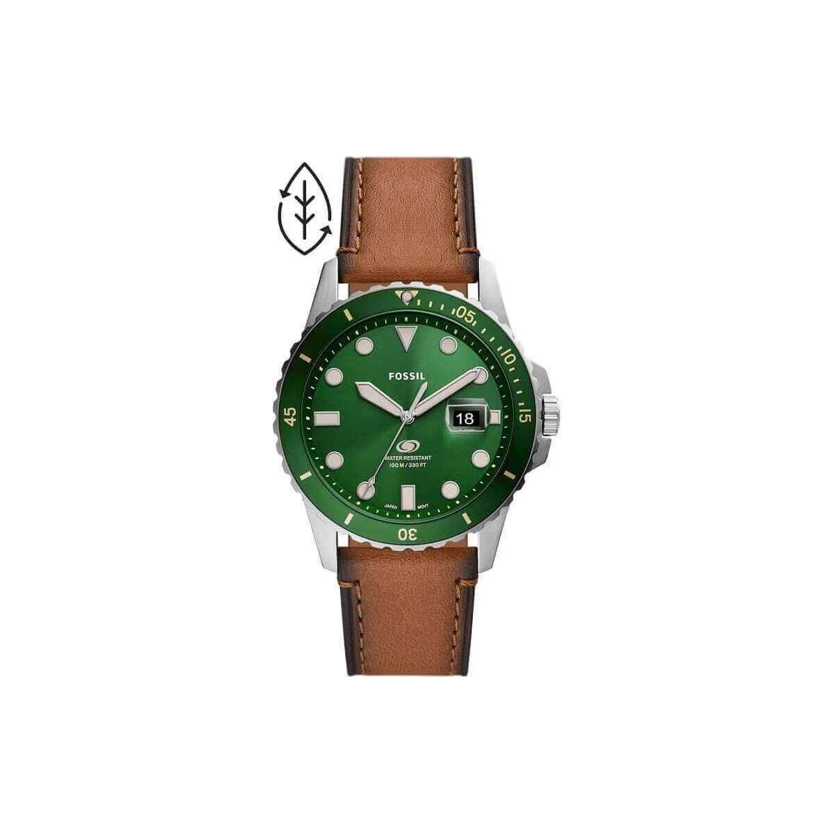 Fossil men's watch, from the Blue collection, with time only function and quartz movement. The watch features a leather-colored leather strap, 42 mm diameter stainless steel case with mineral glass upright and green dial with LumiBrite indexes and hands for better visibility, date window with magnifying glass at three o'clock. Unidirectional green rotating bezel and barb closure.