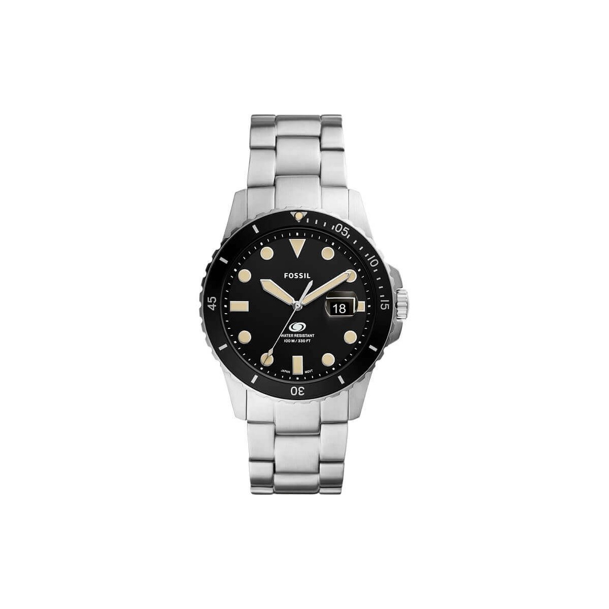 Fossil men's watch, from the Blue collection, with time only function and quartz movement. The watch features a satin-finished steel bracelet, 42 mm diameter case with mineral glass upright and black dial with LumiBrite indexes and hands for better visibility, date window with magnifying glass at three o'clock. Black unidirectional rotating bezel and deployant clasp.