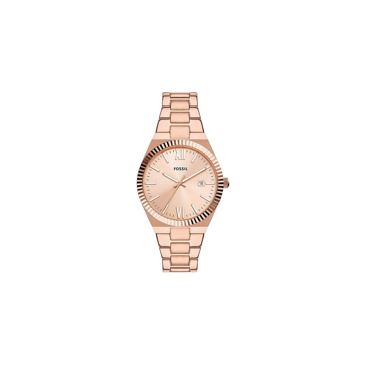Fossil women's watch, from the Scarlette collection, with only time function and quartz movement. The watch has a bracelet made of rose gold steel, 38 mm case, mineral glass and rose gold dial with three gold chronograph counters and Lumibrite hands, alternating Roman numerals and gold steel hour markers. Deployant clasp.