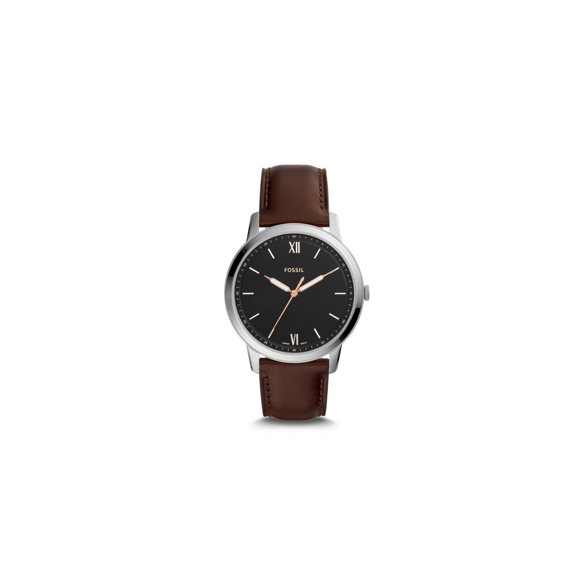 The Minimalist man's watch with three luminous hands, steel case, black dial and brown stitched leather strap; quartz movement