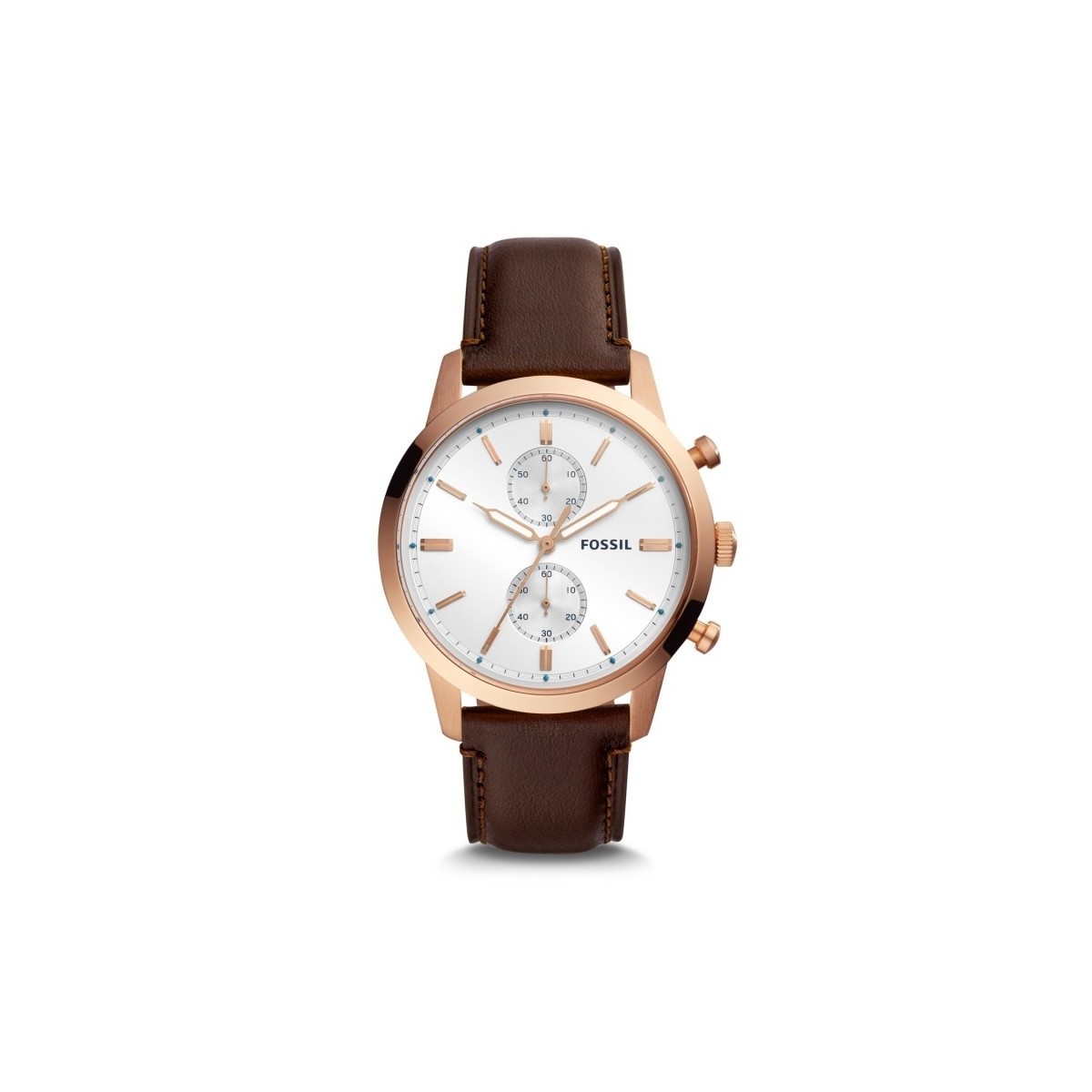 Townsman chronograph line man watch with rose gold pvd case, white dial and chocolate leather strap; quartz movement