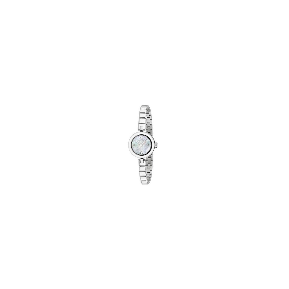 Women's watch with steel case, diamond pattern, white mother of pearl dial and 4 diamonds; stainless steel bracelet