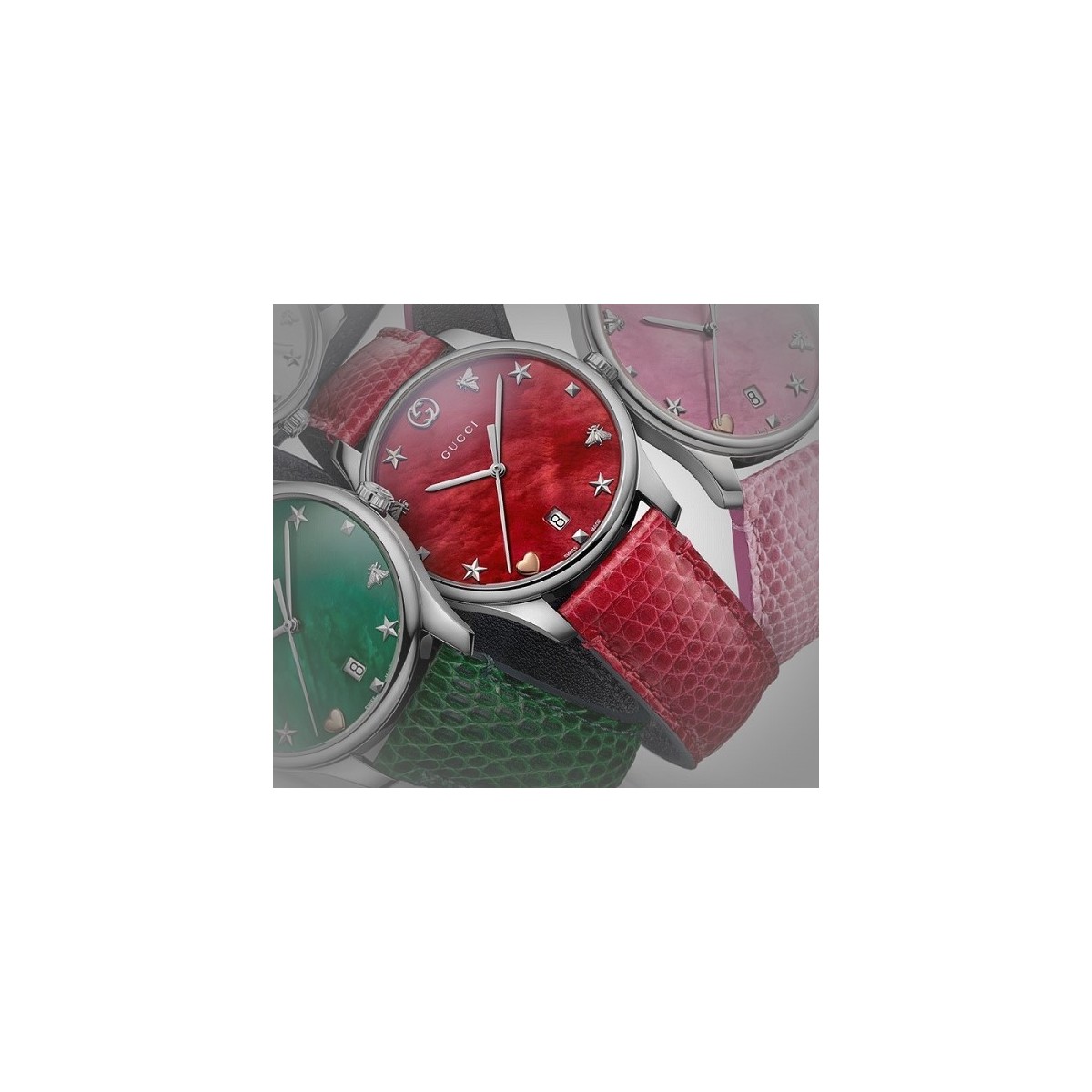 Watch G-Timeless Slim quartz small with stainless steel, red mother of Pearl Dial with indices Bee Icons star heart cherry red leather band.