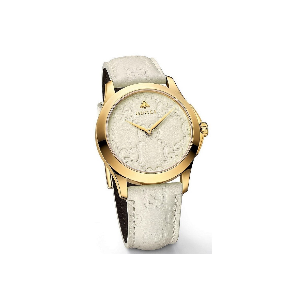 Clock line Signature Collection with stainless steel yellow gold plated, dial and leather strap with Gucci GG print and swiss made quartz movement.