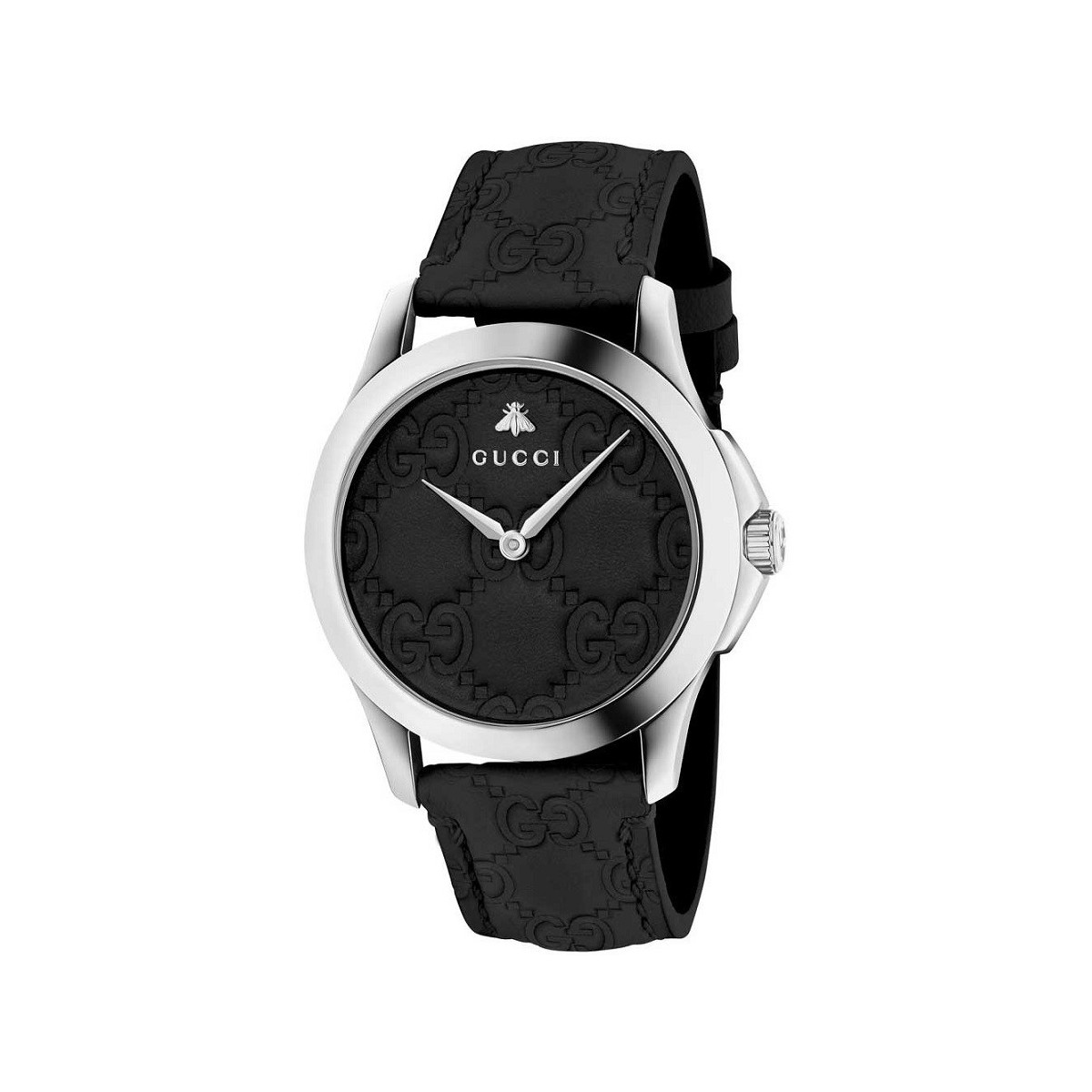 G-Timeless Collection with Quartz Movement; Stainless steel case with smooth ring, black dial tone dial on tone with strap and lego engraved on GG leather. Bee and signature Gucci interior with dial - YA1264031