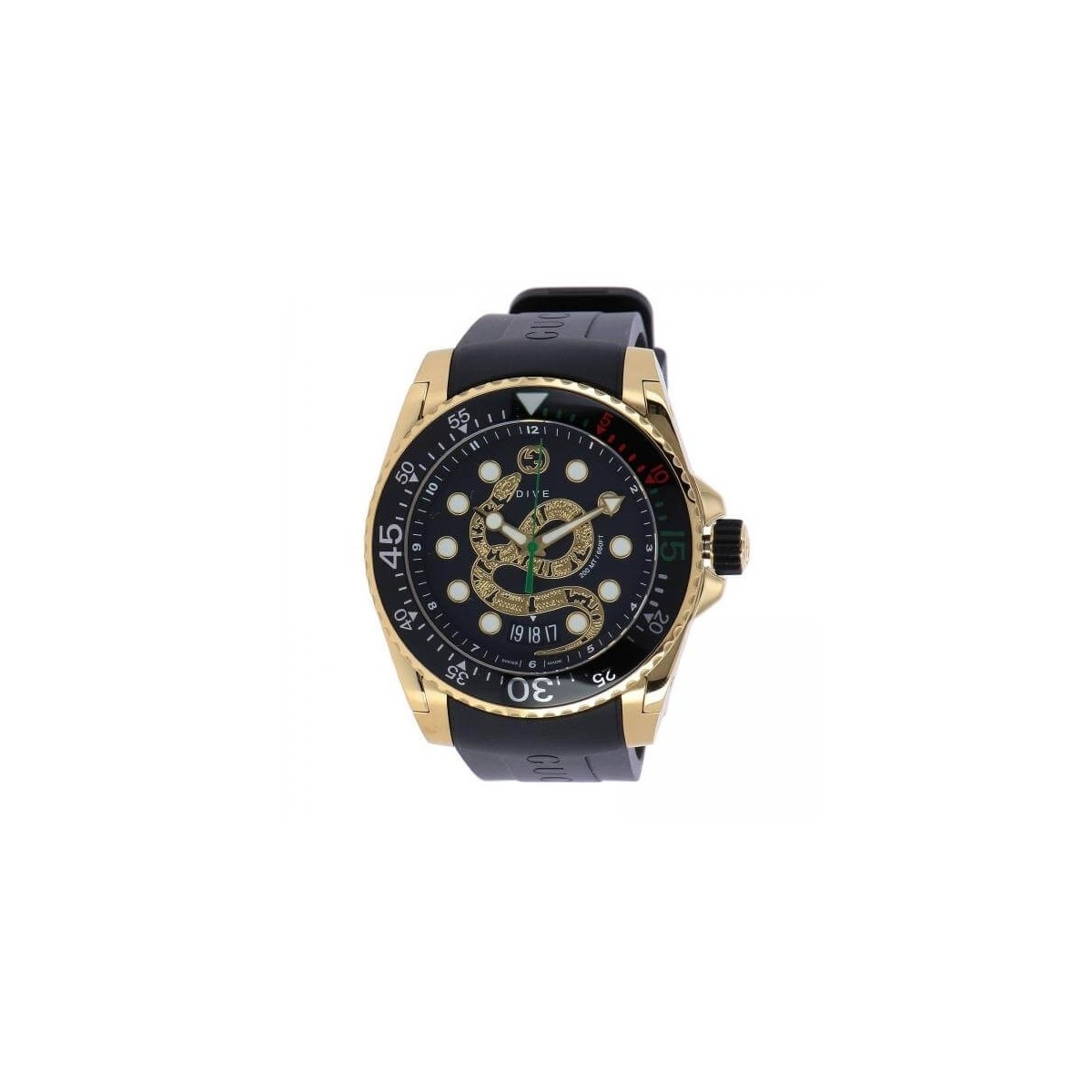 The Gucci Dive watch combines a casual-style rubber strap with one of the distinctive Gucci symbols, the sinuous Kingsnake framed here by a gold-colored PVD case on a black background.