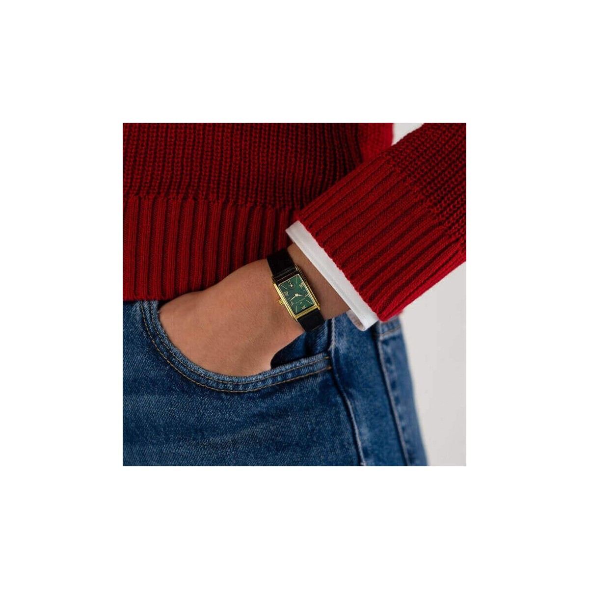 The timepiece features a black leather strap and a rectangular yellow gold PVD steel case that encloses a green dial with contrasting Roman numerals and gold hands featuring silver-colored Roman numerals.