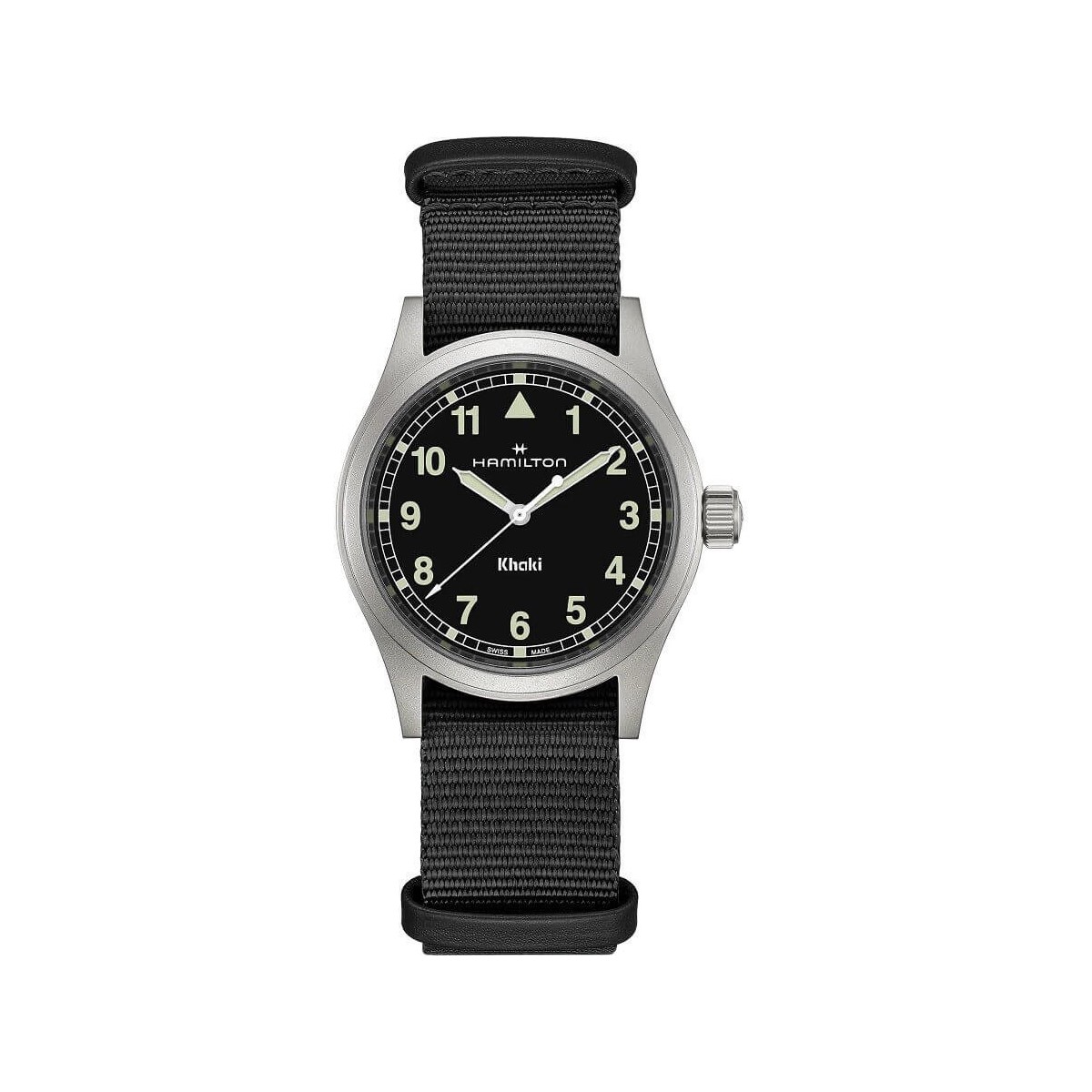 The watch features Hamilton's classic Khaki design with a black dial that is clear and easy to read thanks to the clean and linear font of Arabic numerals.