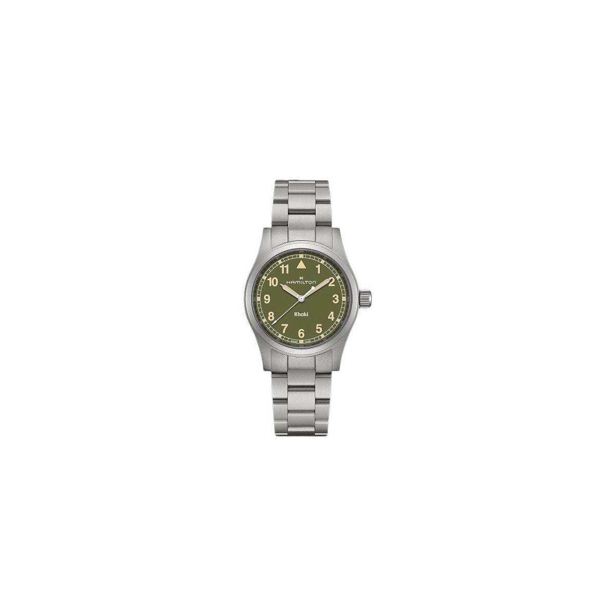 Watch, Khaki Field Quartz line, quartz time only. 33 mm case, green dial with gold Arabic numerals and steel strap.