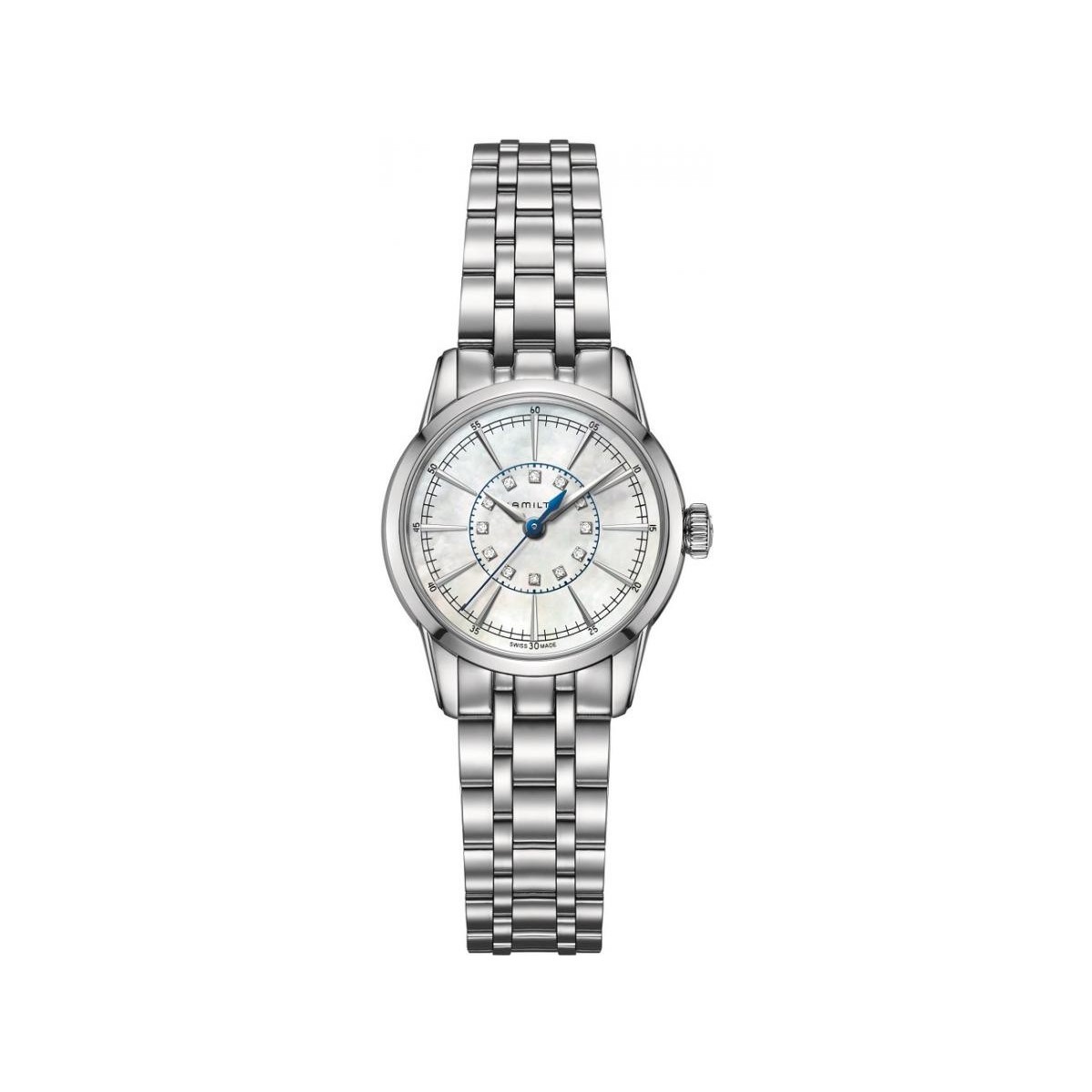 The Hamilton RailRoad Lady Quartz is available in a 28mm case. Different elements, ranging from midnight blue leather straps to diamonds, create a variety of looks, from sporty to glamorous.