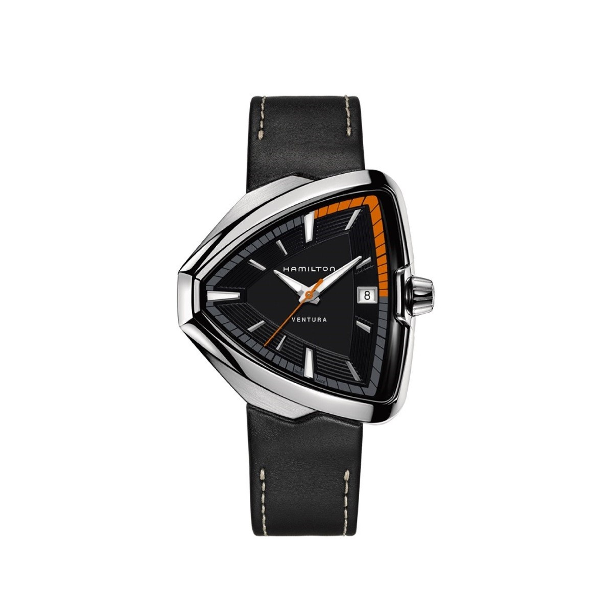 Quartz 80 watch Ventura line model year 2015-typical Elvis triangular steel case with domed Crown side curved and Black stitched leather strap
