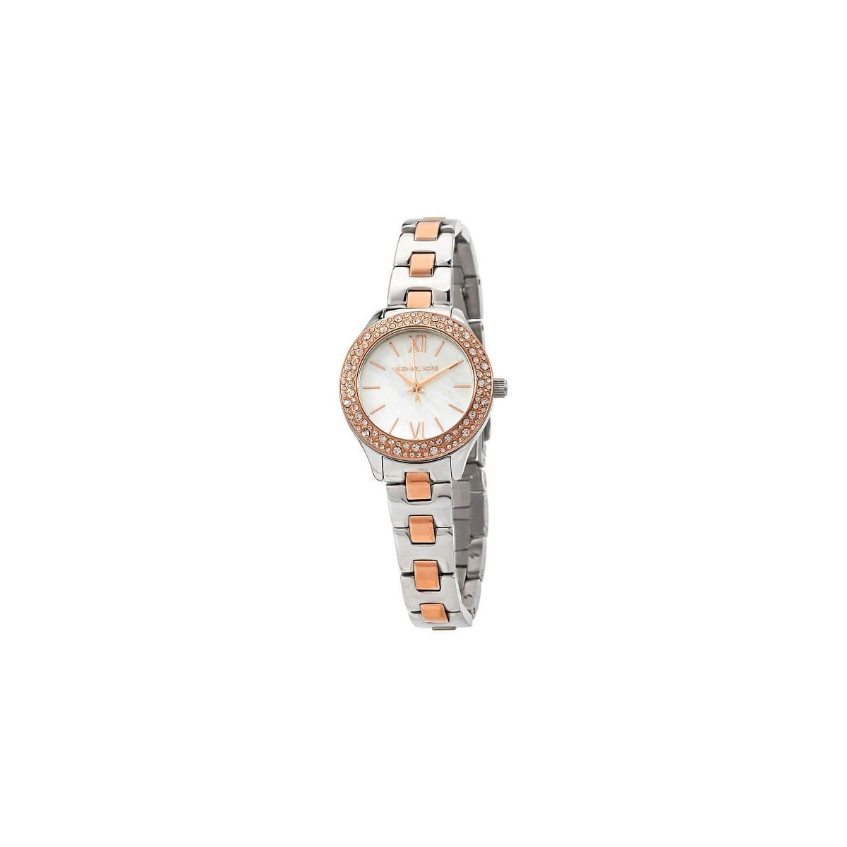 Micheal Kors women's watch, from the Liliane collection, with quartz movement function. The watch is made with a rose gold and silver plated polished link bracelet, a 28 mm case made of stainless steel with a shiny silver-colored finish and a round shape, a bezel embellished with small white stones, mineral glass. Deployant closure.