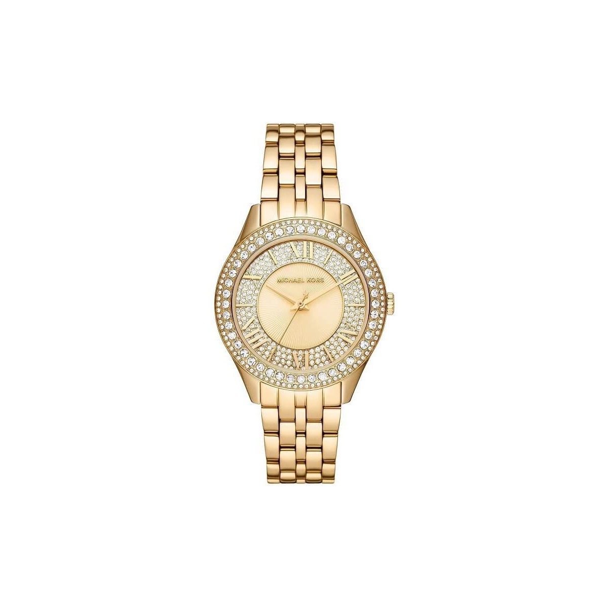 Micheal Kors women's watch, from the Harlowe collection, with quartz movement. The watch is made with a polished gold-colored stainless steel mesh bracelet, 38 mm case and bezel embellished with small white baguette-cut stones, mineral glass. Deployant closure.