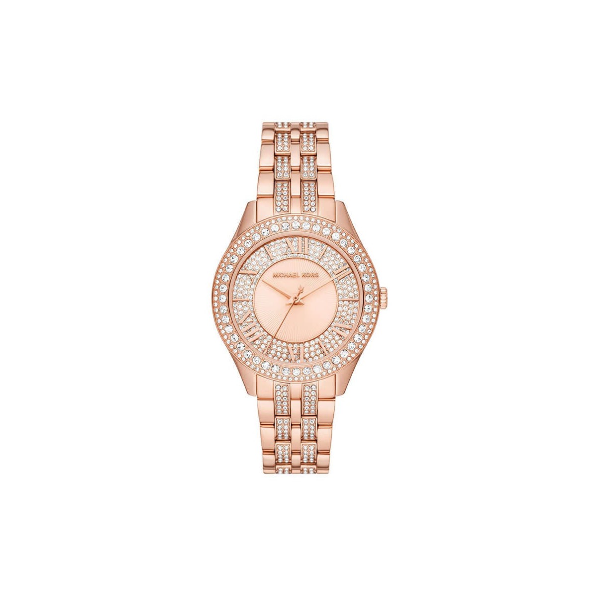 Micheal Kors women's watch, from the Harlowe collection, with quartz movement. The watch is made with a bracelet embellished with small white stones in polished rose gold-colored stainless steel links, 38 mm case and bezel embellished with small white baguette-cut stones, mineral glass. Deployant closure.