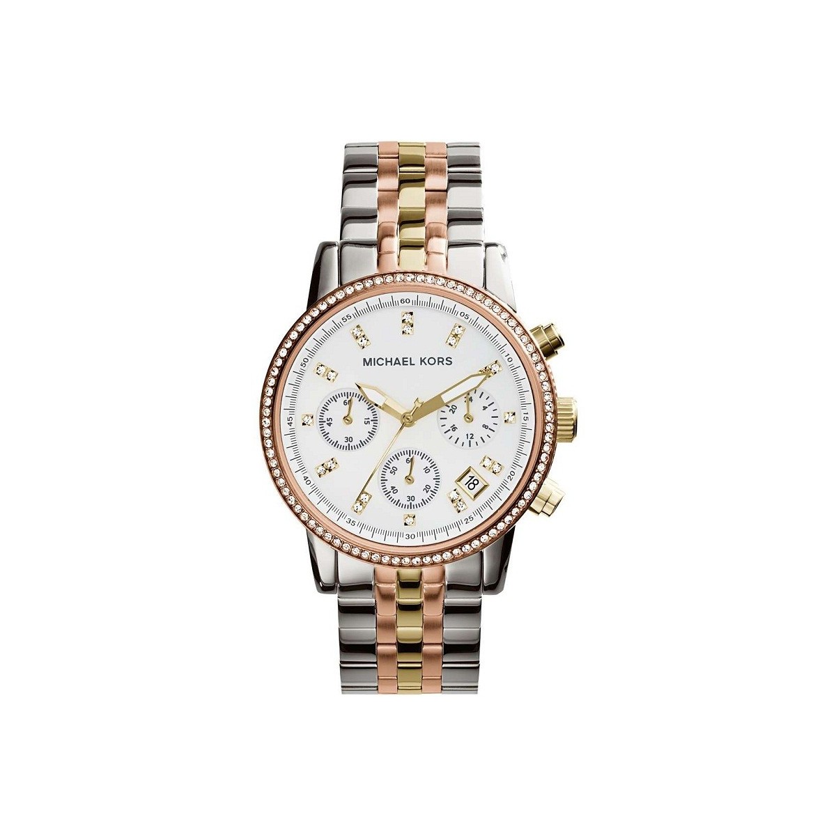 Michael Kors watch-solo tempo with stainless steel case and bracelet-Rose Gold Ip With Glitz, quartz movement with Chronograph and date. White Dial.