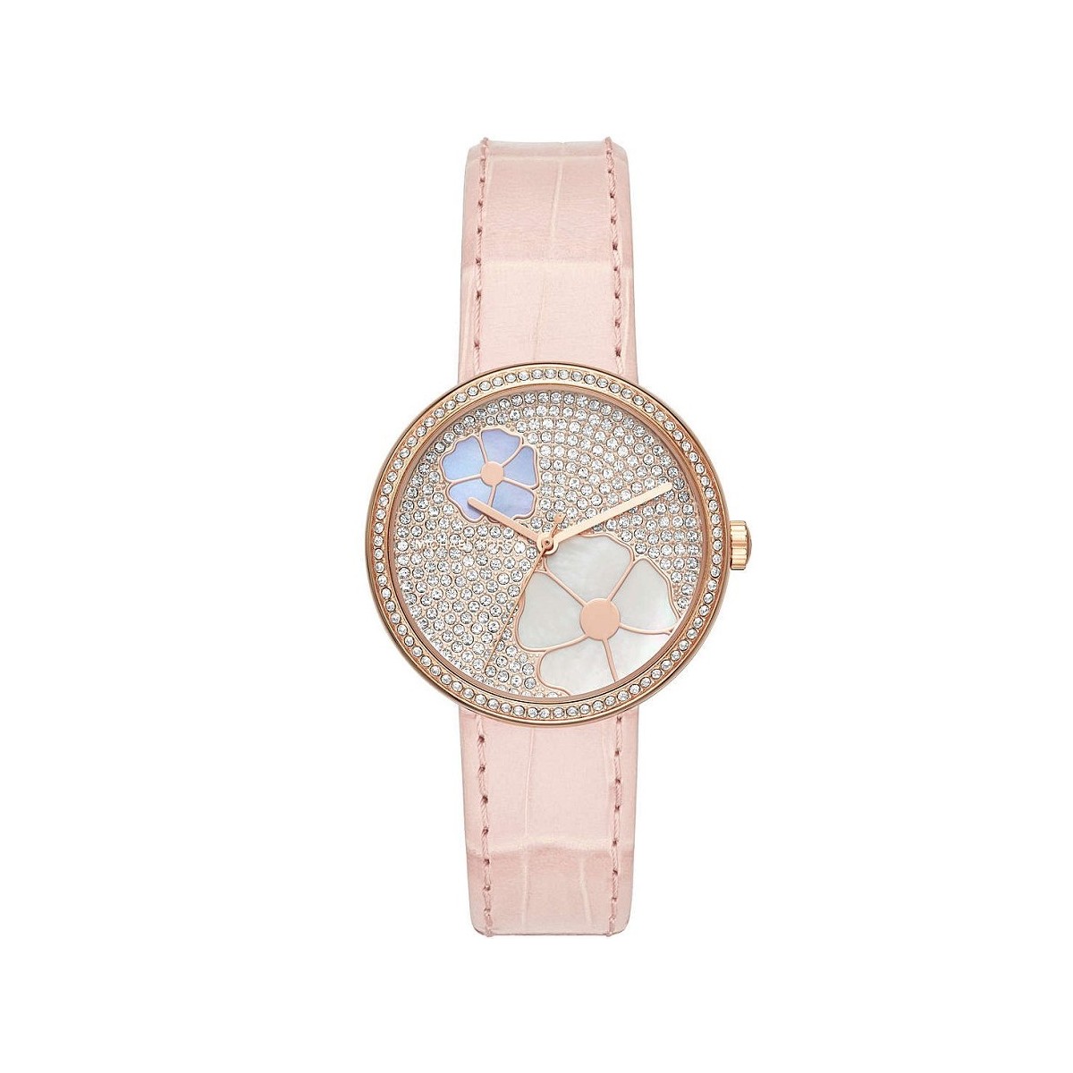 Round case in rosé stainless steel with 36mm diameter crystals and 10mm thickness; quadrant in pink pavè with two flowers, transparent glass, without indexes and with golden hands.
