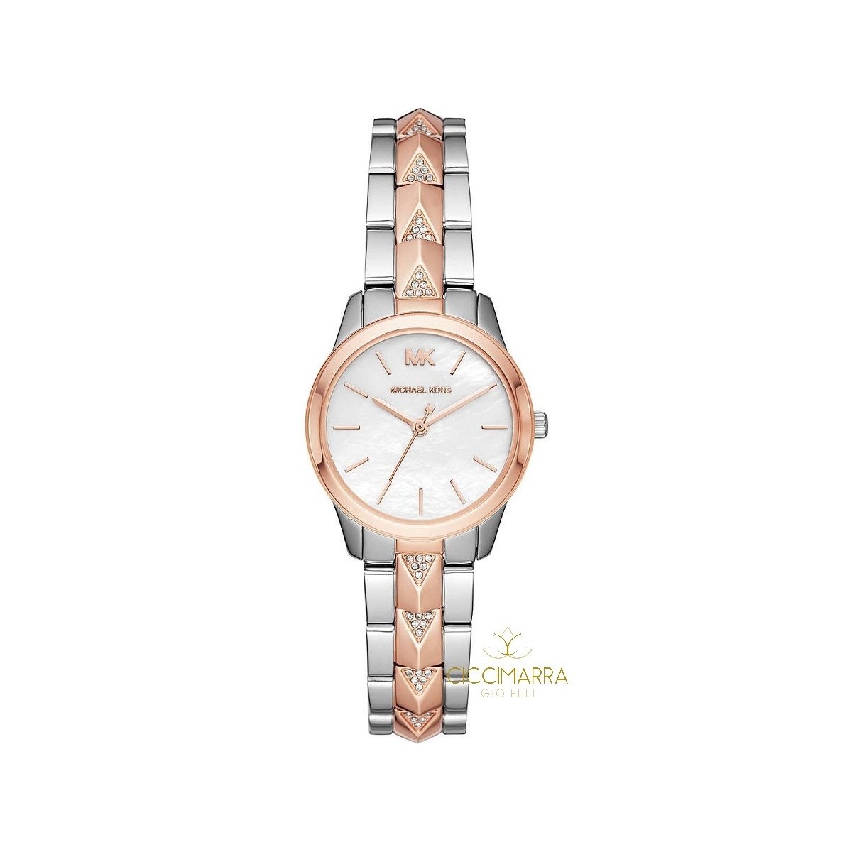 Runway women's watch with bicolor stainless steel case and strap, silver and rose gold and crystals, mother of pearl dial and quartz movement