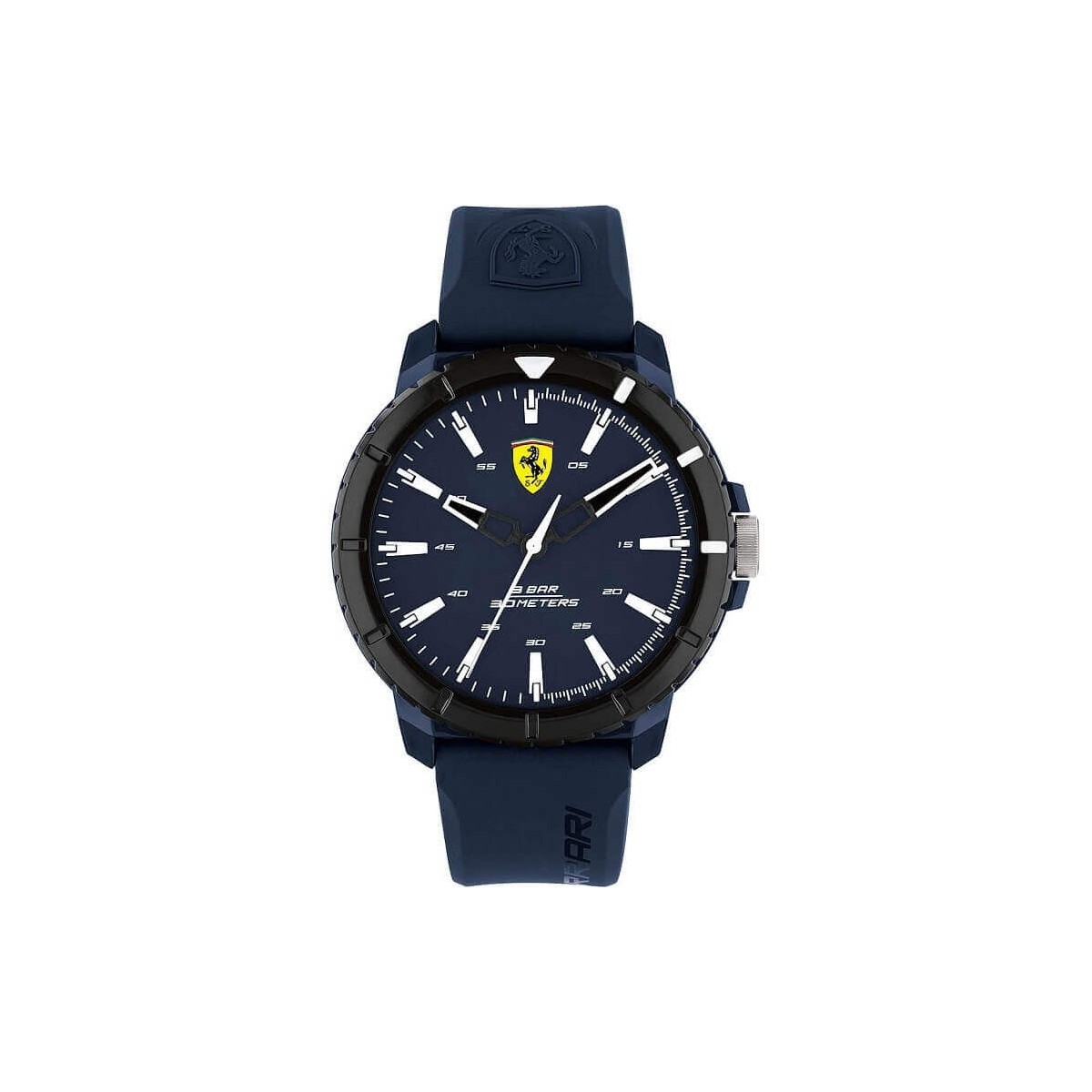 Scuderia Ferrari men's watch, from the Forza Evo collection, with time only function and quartz movement. The watch has a blue silicone strap with a ton sur ton embossed company logo, a 44 mm diameter case with blue PVD processing upright mineral glass and a blue dial with white indexes and hands and logo at 12 o'clock. with steel buckle.