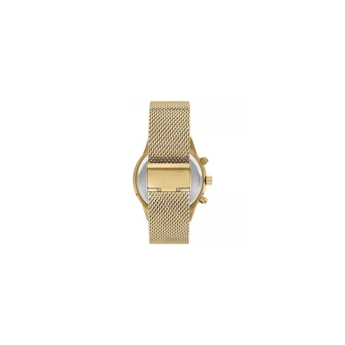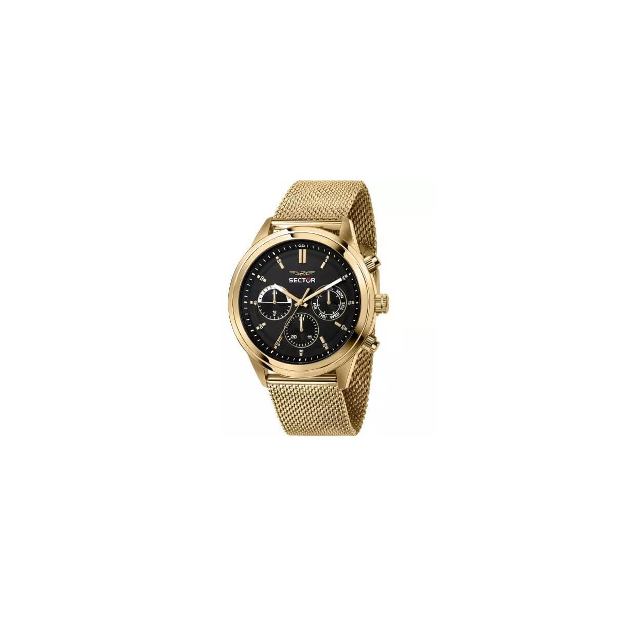 Male watch from the 670 collection, with golden steel case with side buttons and metal strap with gold finish and Milanese mesh, clip closure with hook, black dial with golden indexes and hands, quartz movement with chronograph function.
