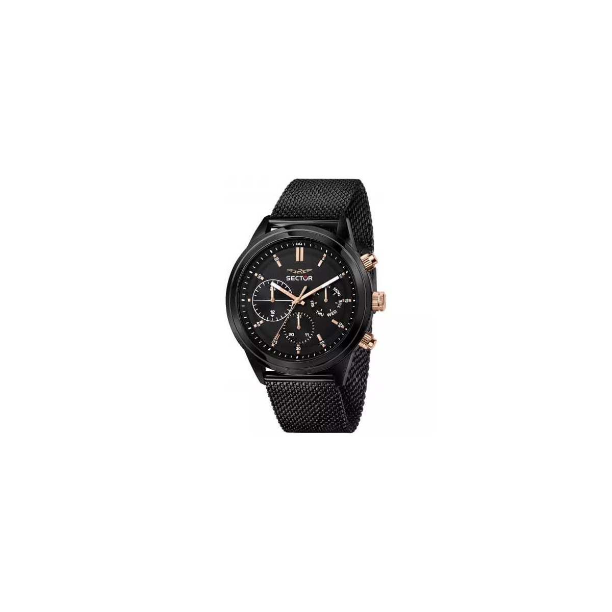 Male watch from the 670 collection, with black steel case with rose gold pvd side buttons, black Milanese mesh metal strap, clip closure with hook, black dial with rosé indexes and hands, quartz movement with chronograph function.