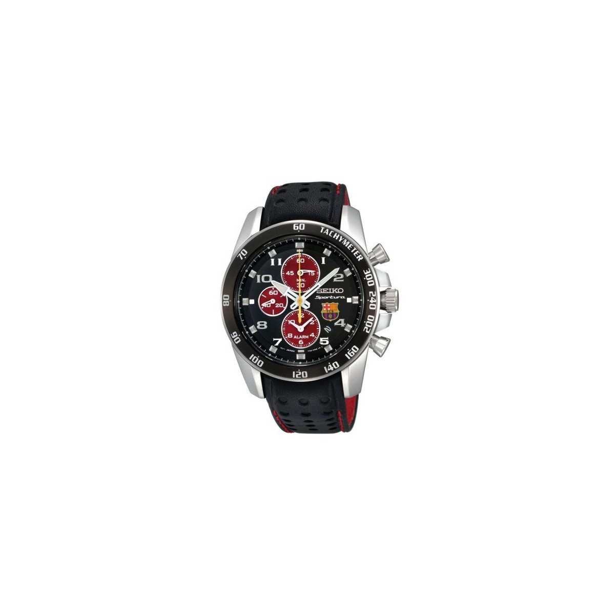 The watch is made with a black structured leather strap with visible red stitching, the steel case has a diameter of 42 mm sapphire crystal upright with anti-scratch and anti-reflective processing, the black dial with burgundy chronograph counters, LumiBrite hands and yellow second hand echoing the colors of Barcelona, whose logo can be found at 3 o'clock.