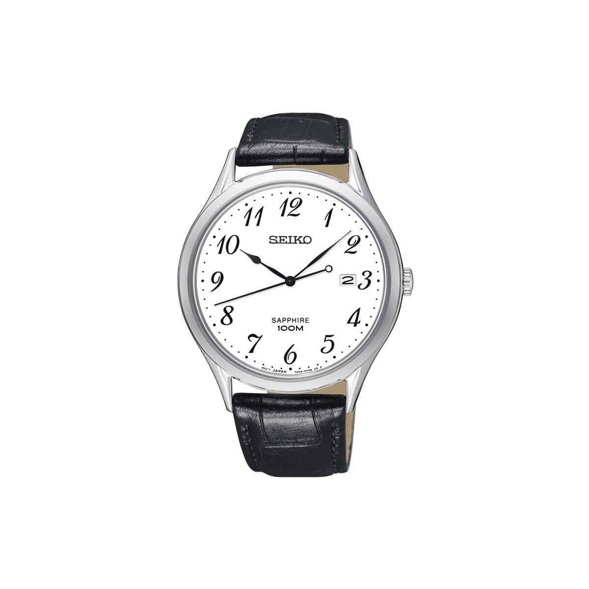 Man woman watch with stainless steel case and black leather strap, white dial with black numbers and hands and date display. Case material: Stainless steel; Glass material: Sapphire; Strap material: Calf leather; Water resistance: 10 bar; Case size: Thickness: 8.5 ", Diameter: 40"; Other specifications: Screw-down back; Reference: SGEH75P1