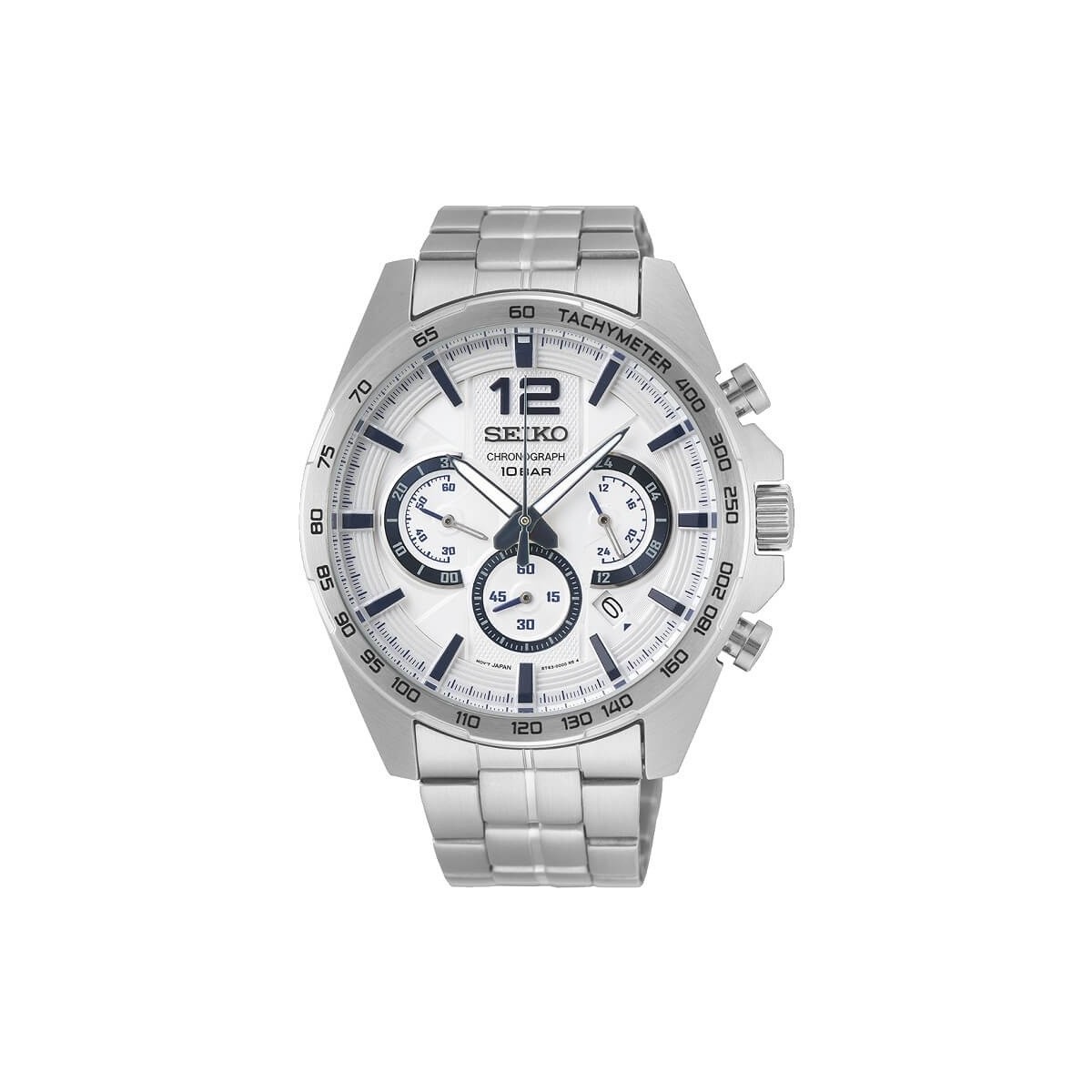 SEIKO men's chronograph watch with white dial.