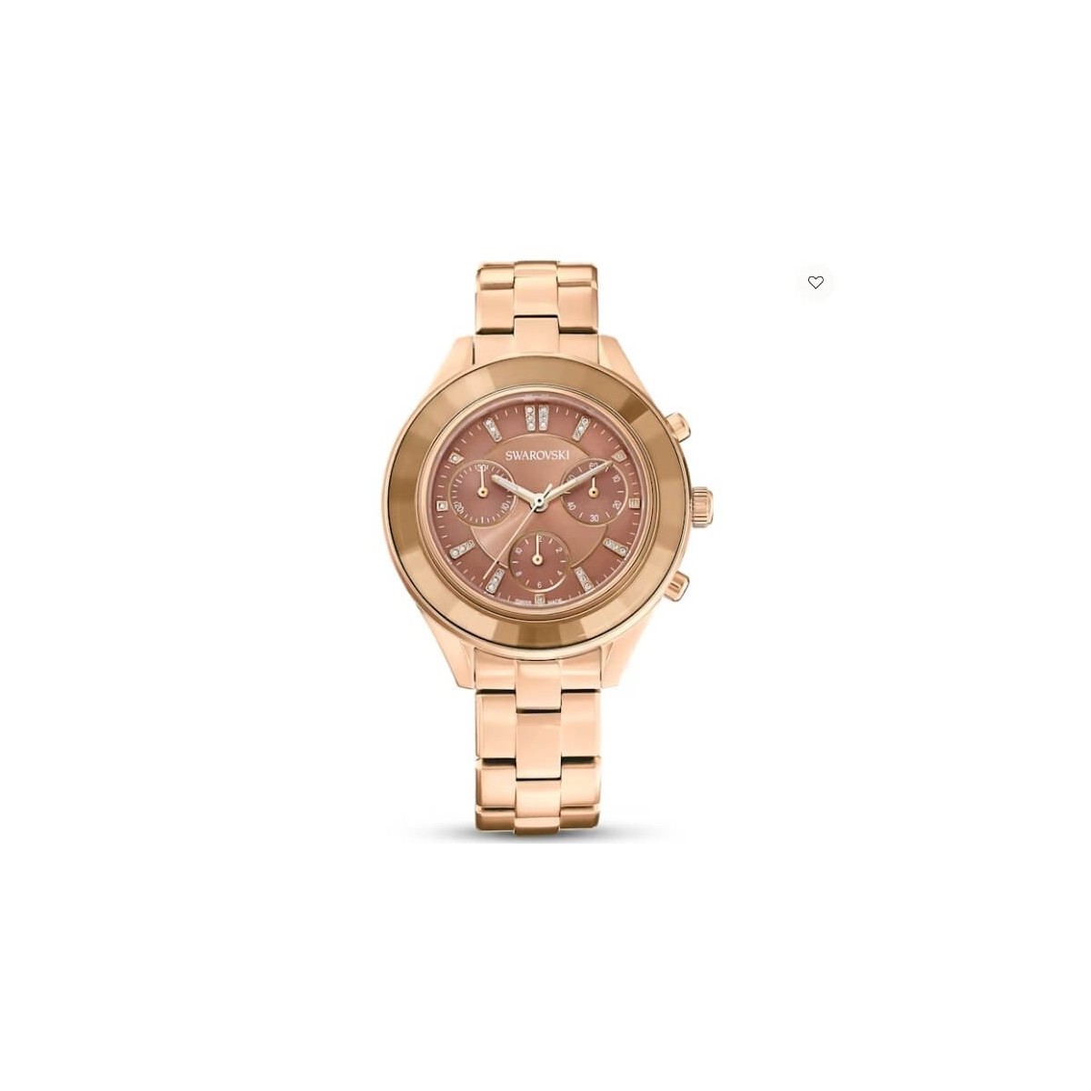 Watch suitable for both sexes Swarovski, from the Octea Lux Sport collection, with chronograph function and quartz movement. The watch features a modern golden link bracelet with 37 mm case and sunrise effect dial in yellow gold and tone-on-tone crystal bezel that accentuates its brilliance. On the dial there are 3 chronograph counters and cleats embellished with small white crystals. Deployant clasp.