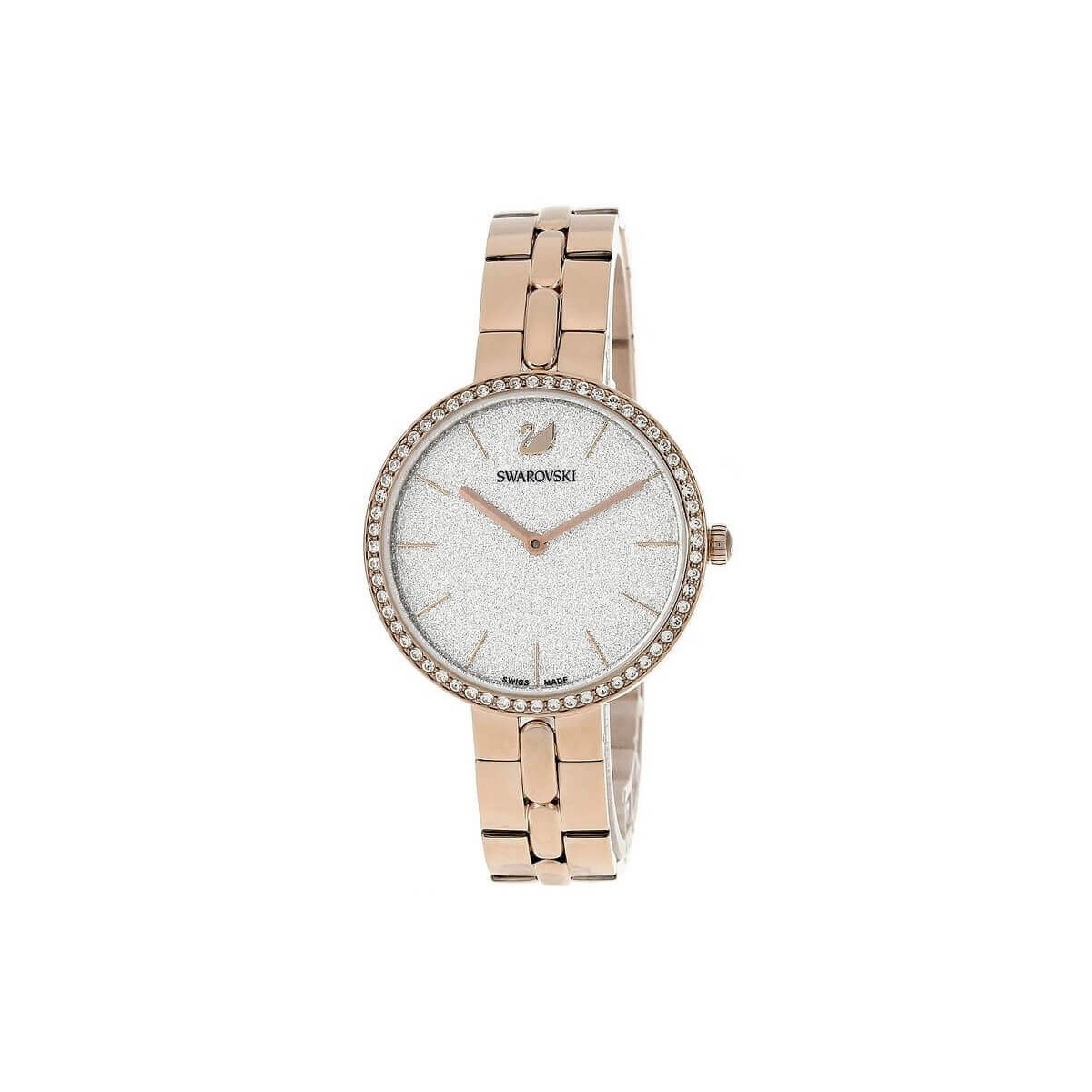 Swarovski women's watch, from the Cosmopolitan collection, with only time function and quartz movement. The watch features a champagne gold-plated steel strap, 32 mm case with bezel embellished with crystal pavé and a bright glitter dial with golden details.