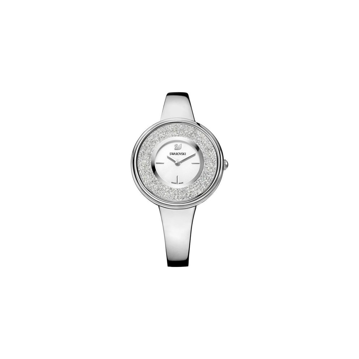 Thanks to the irresistible brilliance of Swarovski crystals exalted by 850 exclusive setting Crystalline, this watch will enhance each item due to its refined femininity. A radial pattern dial silver-white and a steel strap complete this wrist instrument, to be combined easily with other Swarovski creations. 34 mm case; water resistant to 50 m; Swiss Made.