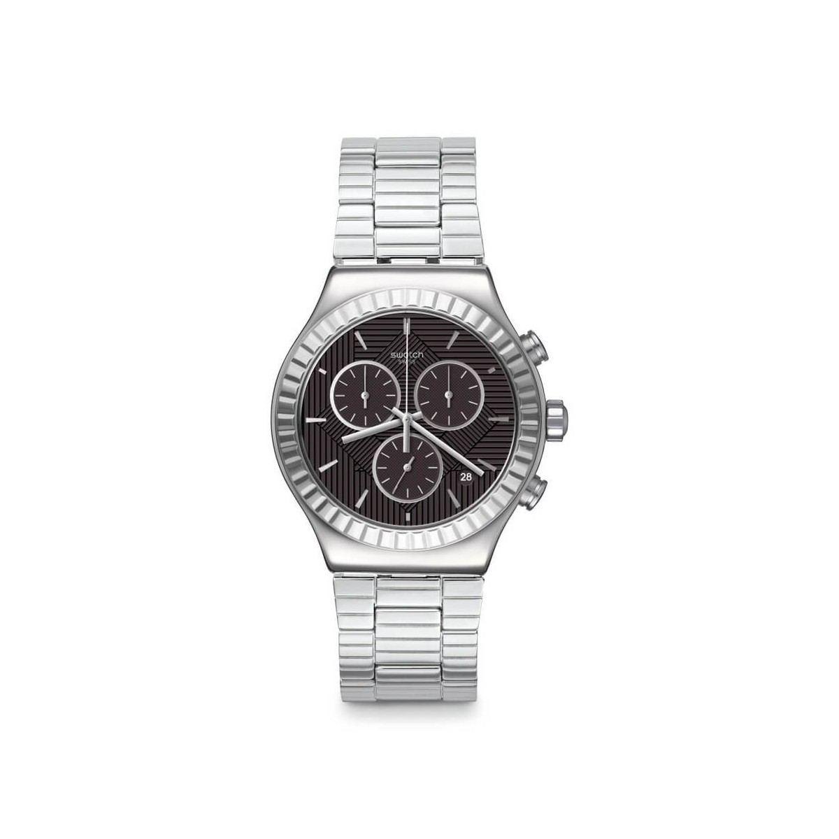 Swatch joe's smile watch from the I New Chrono collection with quartz chronometer movement, 43 mm round-shaped steel case in silver color and silver-colored steel strap