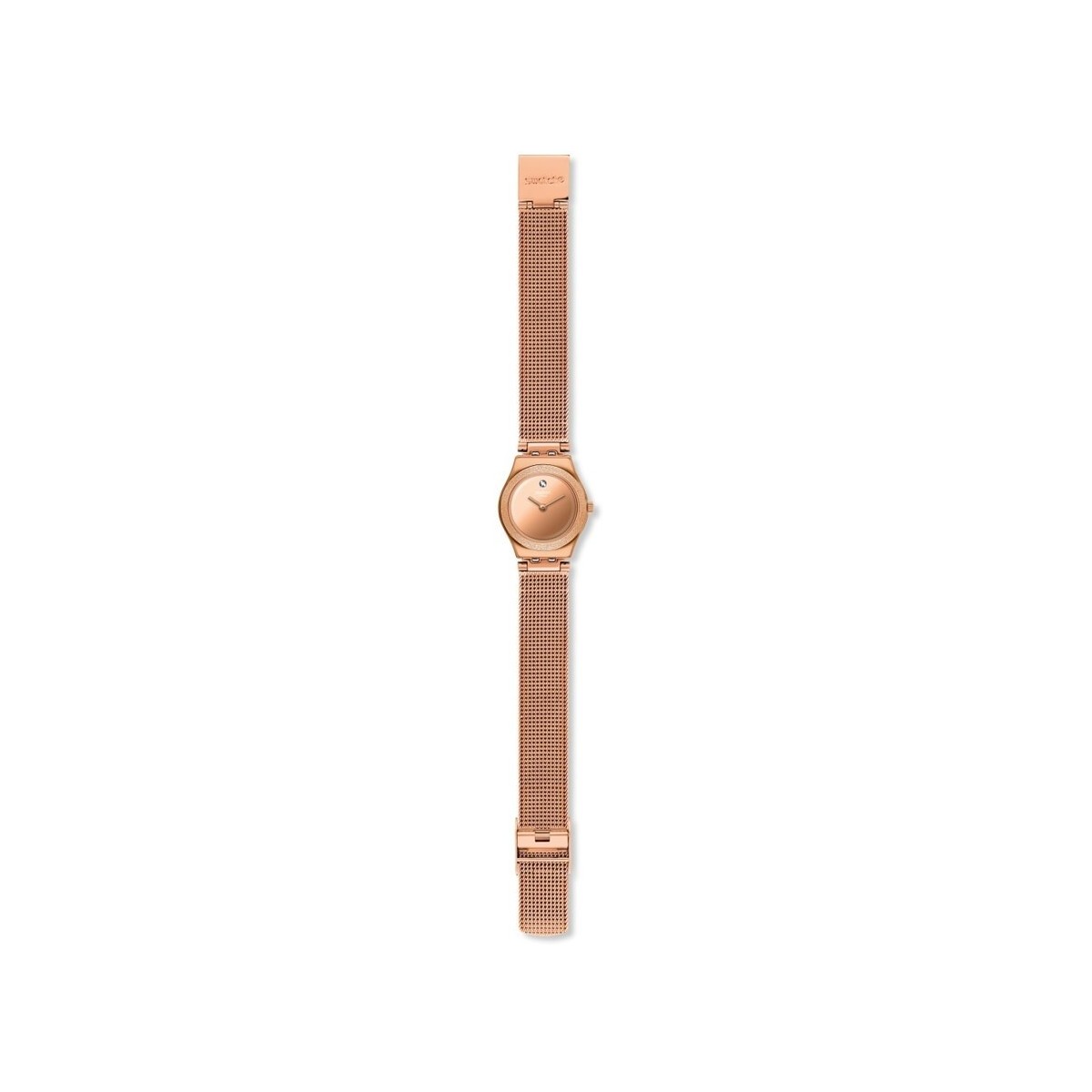 Swatch luminescent rose watch from the I Lady collection with quartz time only movement, 25 mm round-shaped rose gold PVD steel case and rose gold PVD Milanese mesh strap with sparkling effect
