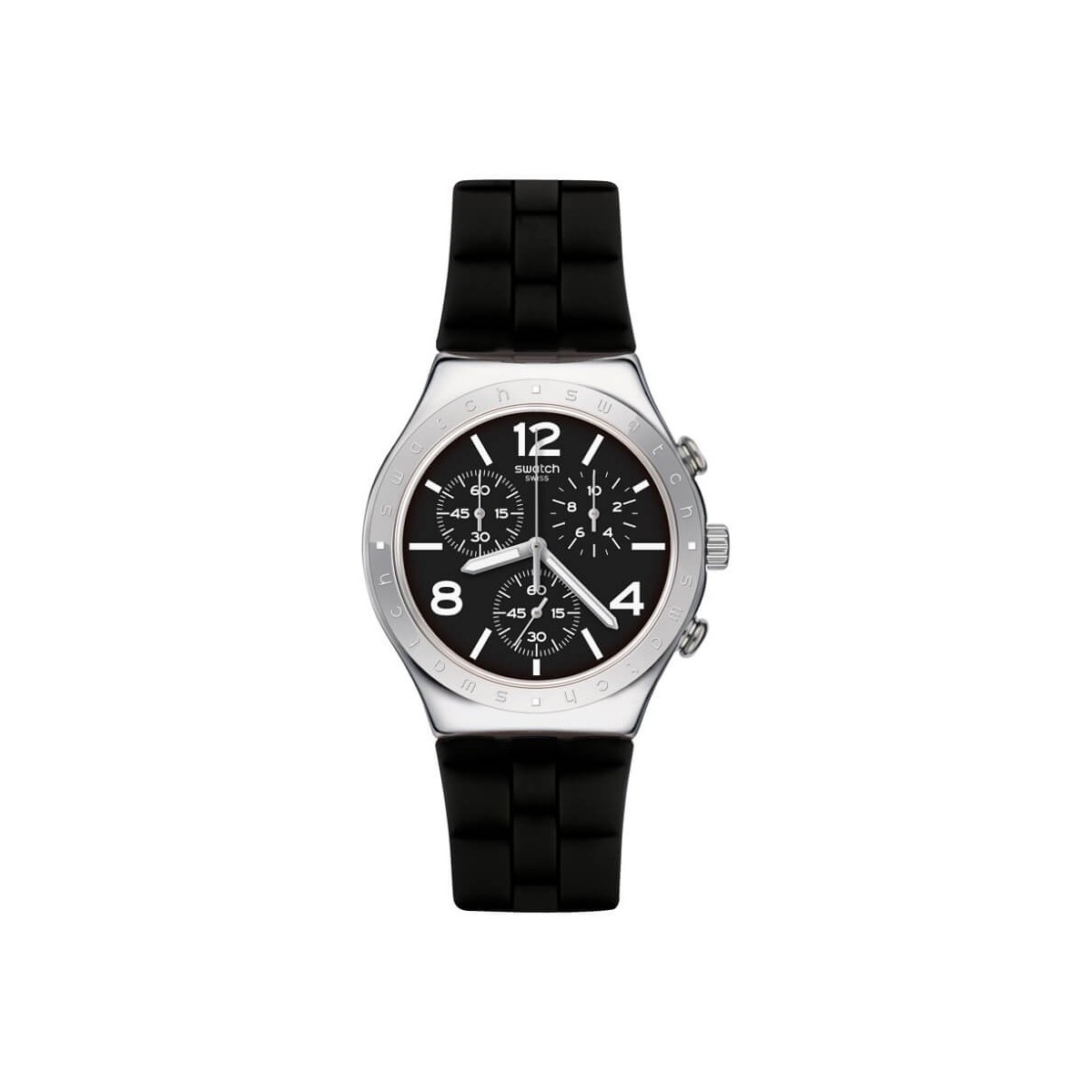 Swatch Men's Watch, from the Bleu De Bienne collection, with chronograph function and Swiss quartz movement. Watch made with black structured silicone strap, 40 mm steel case and black dial with three spheres, alternating Arabic numerals and LumiBrite indexes and hands. Closure with steel buckle.