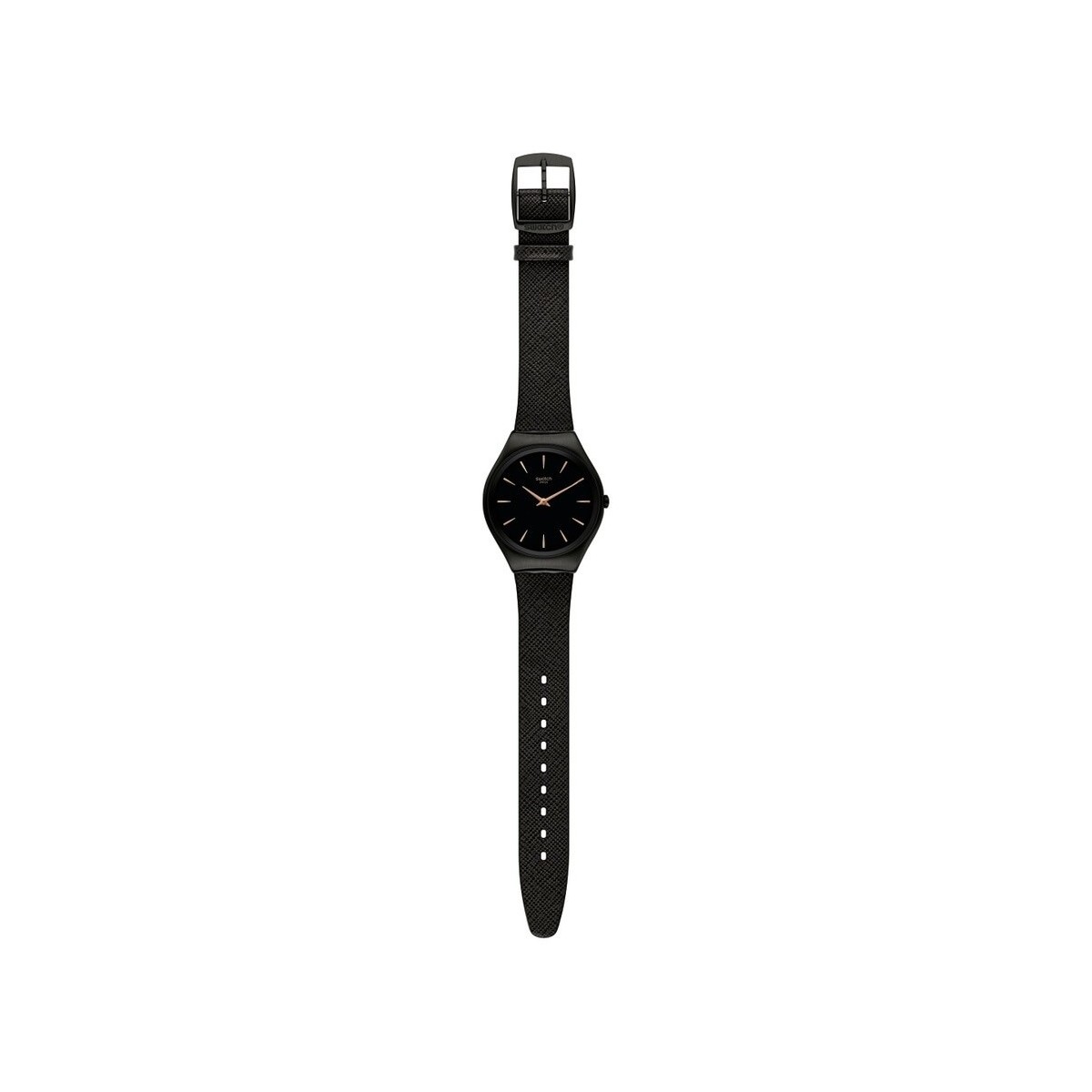 Swatch Skin Night model watch from the Skin Irony collection with quartz time only movement, black steel case and 38 mm round shape and black leather strap